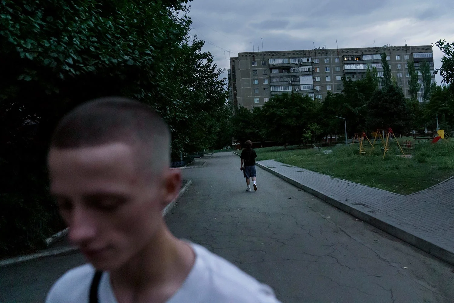 Roman Kovalenko, 19, left, walks away after visiting his friend, Oleksandr Pruzhyna, 18, at his apartment complex for their weekly get together in Kramatorsk, Donetsk region, eastern Ukraine, Friday, Aug. 12, 2022. (AP Photo/David Goldman)