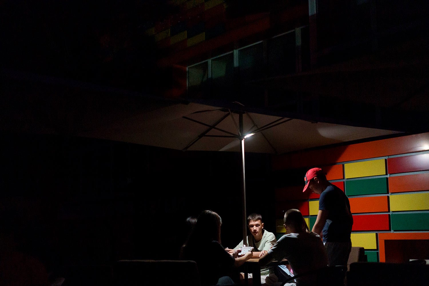 Youth gather to play cards at a coffee shop before curfew in Pokrovsk, Donetsk region, eastern Ukraine, Thursday, Aug. 11, 2022. Pokrovsk, a town that's relative distance from the front line, allows for more socializing among young people as those in front line towns face boredom and isolation since most of their peers have fled. (AP Photo/David Goldman)