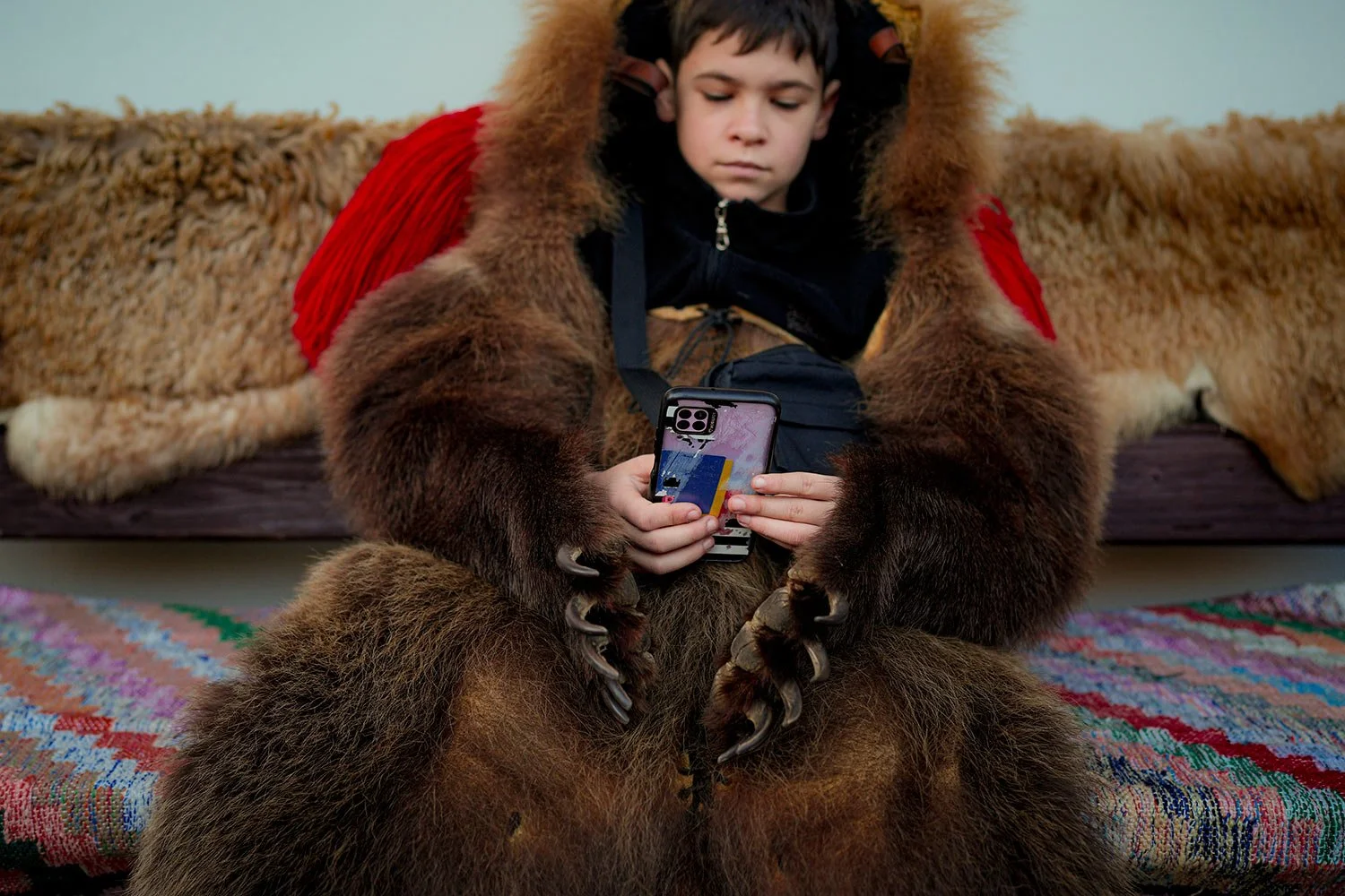 A boy looks at a mobile phone while waiting, dressed in a bear fur costume, to take part in a parade showcasing regional winter traditions in Comanesti, northeastern Romania, Friday, Dec. 30, 2022. (AP Photo/Vadim Ghirda)