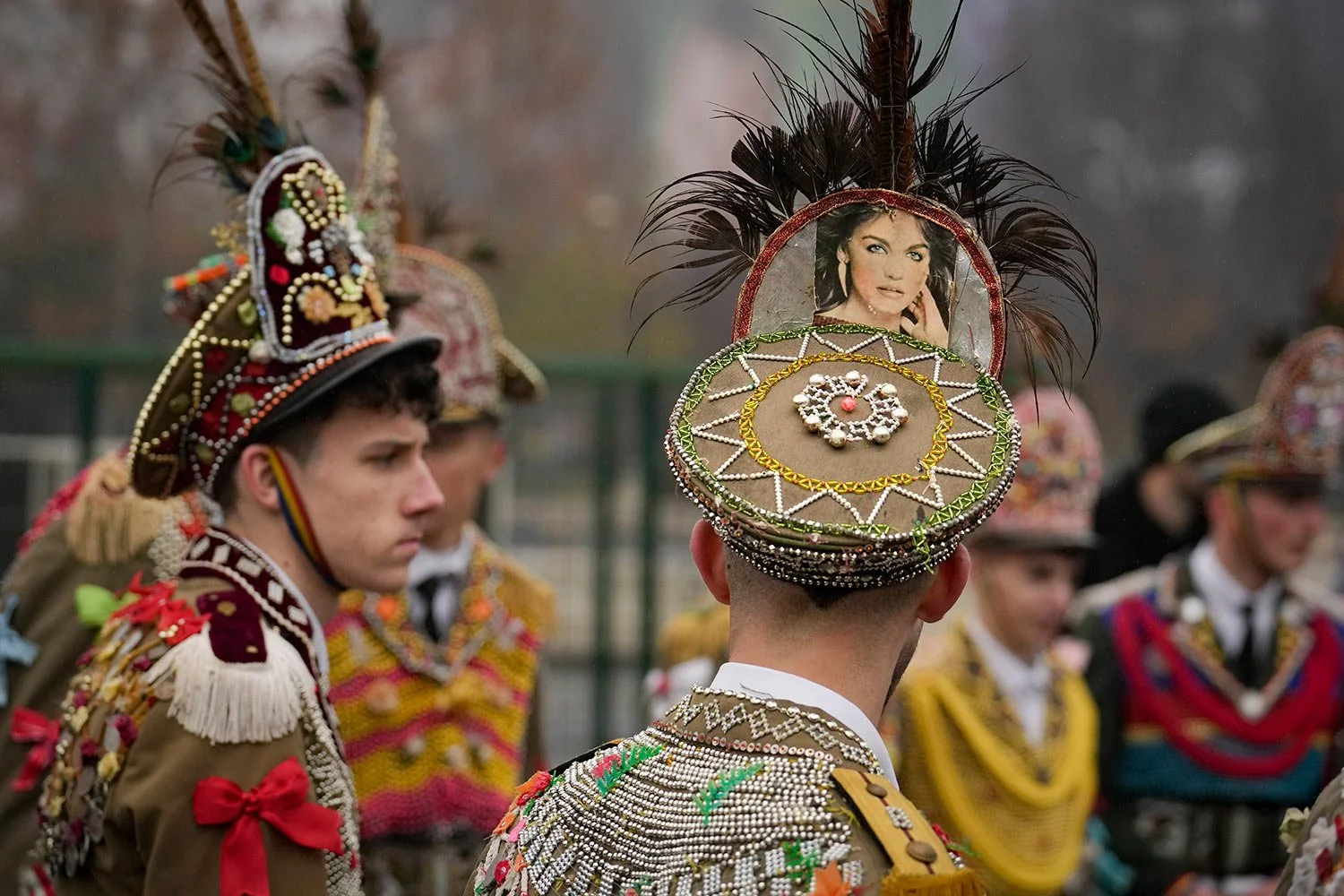 People wearing communist-era military uniforms decorated with colorful items participate in a parade showcasing winter traditions from the northeast of the country in Bucharest, Romania, on Sunday, Dec. 18, 2022. (AP Photo/Vadim Ghirda)