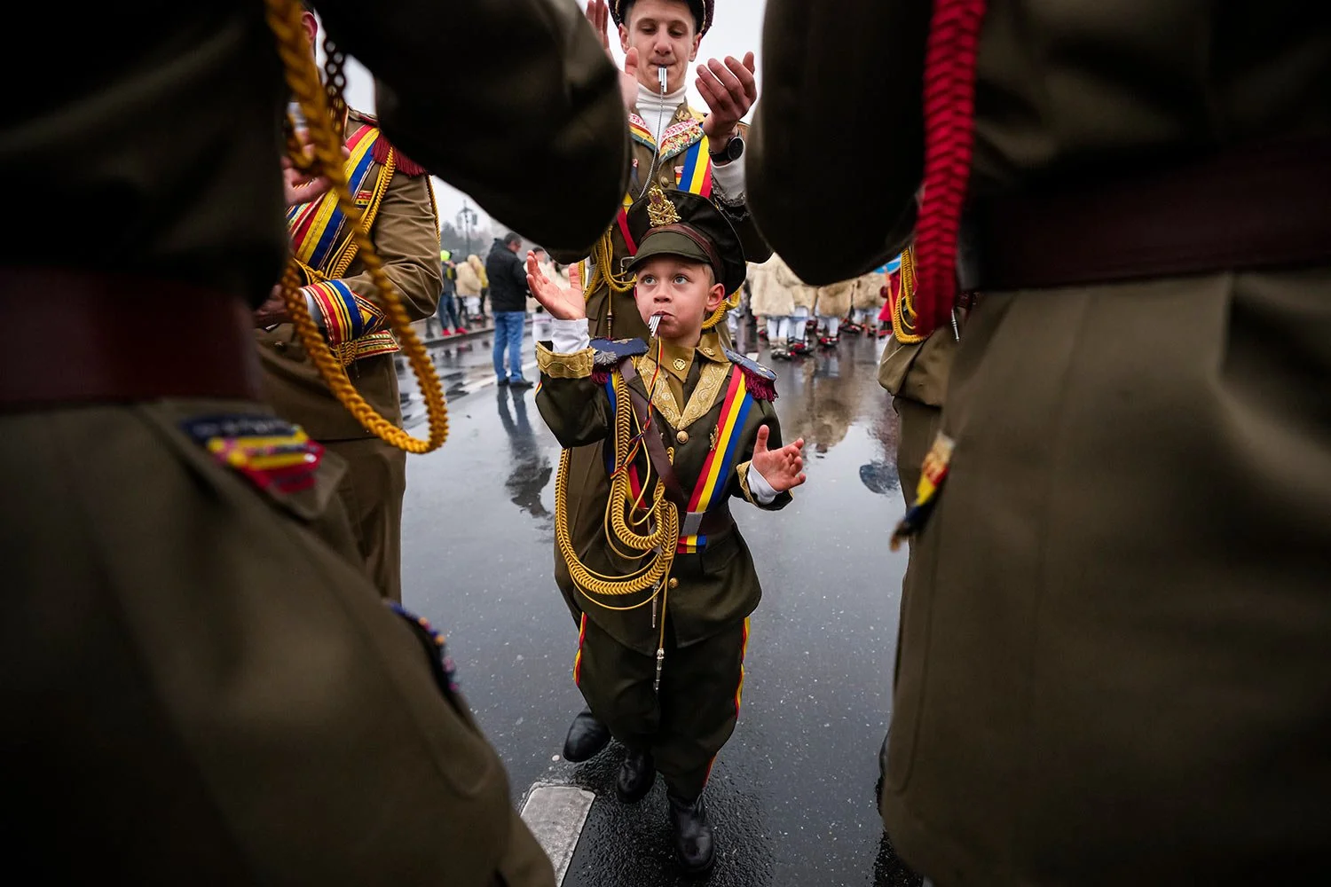 A little boy dances during a parade showcasing regional winter traditions in Comanesti, northeastern Romania, Friday, Dec. 30, 2022. (AP Photo/Vadim Ghirda)