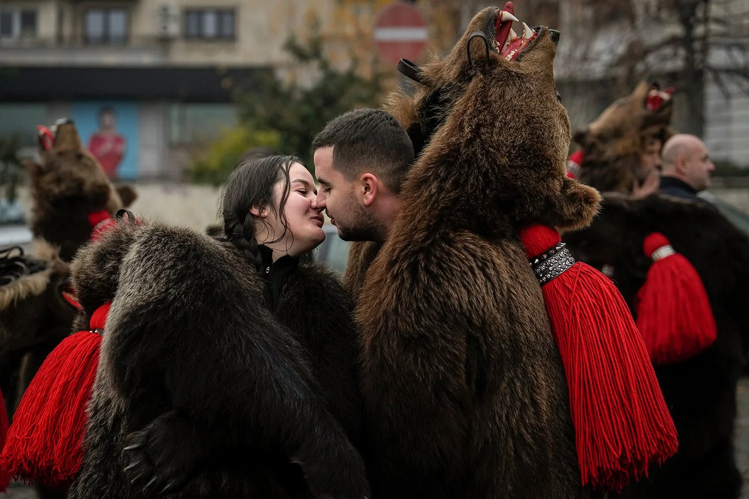 A couple wearing bear fur costumes kiss before taking part in a parade showcasing winter traditions from the northeast of the country in Bucharest, Romania, Sunday, Dec. 18, 2022. (AP Photo/Vadim Ghirda)