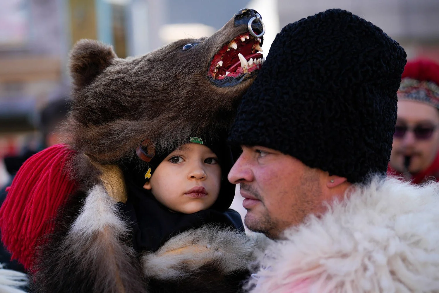 A man holds a toddler wearing a bear fur costume during a parade showcasing regional winter traditions in Comanesti, northeastern Romania, Friday, Dec. 30, 2022. (AP Photo/Vadim Ghirda)