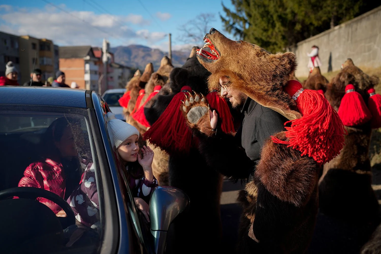 A man wearing a bear fur costume waves to a little girl during a parade showcasing regional winter traditions in Comanesti, northeastern Romania, Friday, Dec. 30, 2022. (AP Photo/Vadim Ghirda)