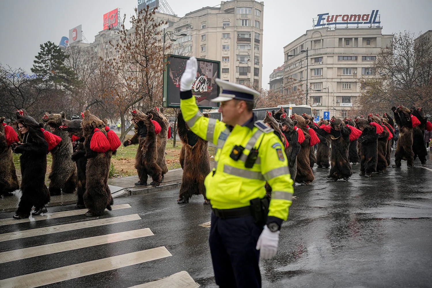 A policeman stops vehicles for people wearing bear fur costumes to cross a street during a parade showcasing winter traditions from the northeast of the country in Bucharest, Romania, Sunday, Dec. 18, 2022. AP Photo/Vadim Ghirda)