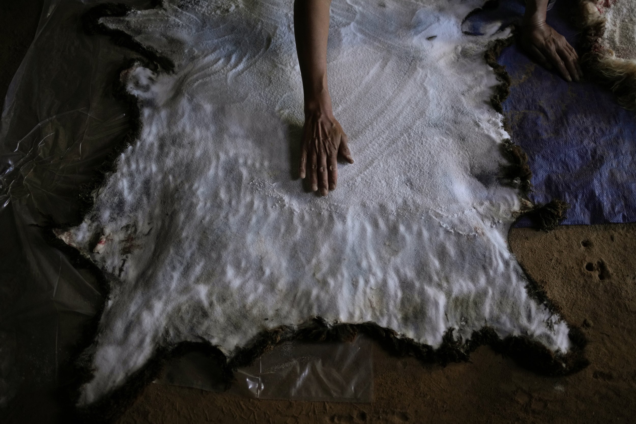Jay Begay spreads salt to dry out the hide of a sheep at his home Friday, Oct. 28, 2022, in the community of Rocky Ridge, Ariz., on the Navajo Nation. (AP Photo/John Locher)
