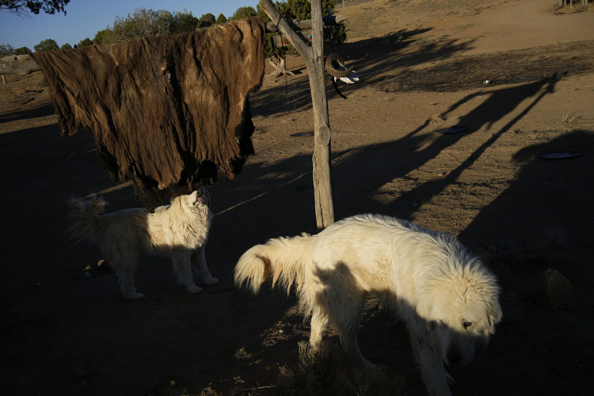 Sheepdogs belonging to Jay Begay stand near a drying sheep hide Monday, April 10, 2023, in the community of Rocky Ridge, Ariz., on the Navajo Nation. (AP Photo/John Locher)