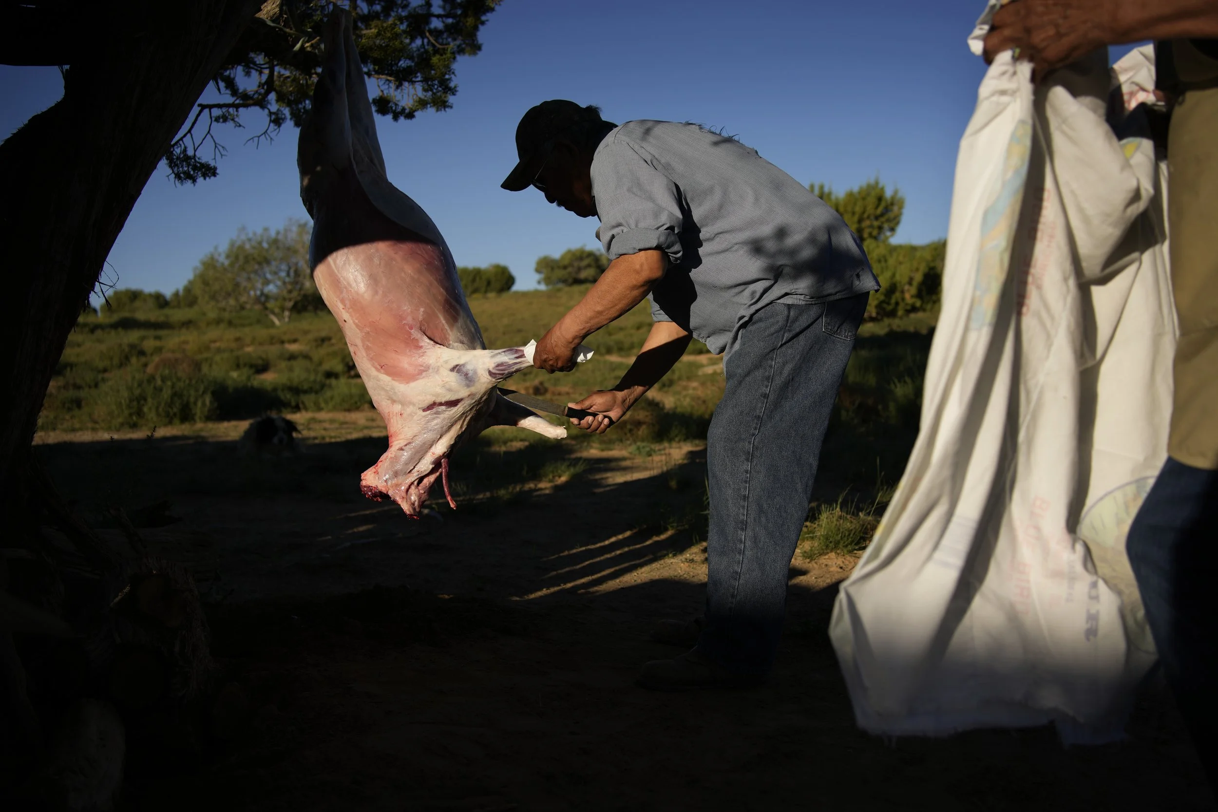 Jay Begay Sr. slaughters a sheep Wednesday, Sept. 6, 2023, in the community of Rocky Ridge, Ariz., on the Navajo Nation. (AP Photo/John Locher)