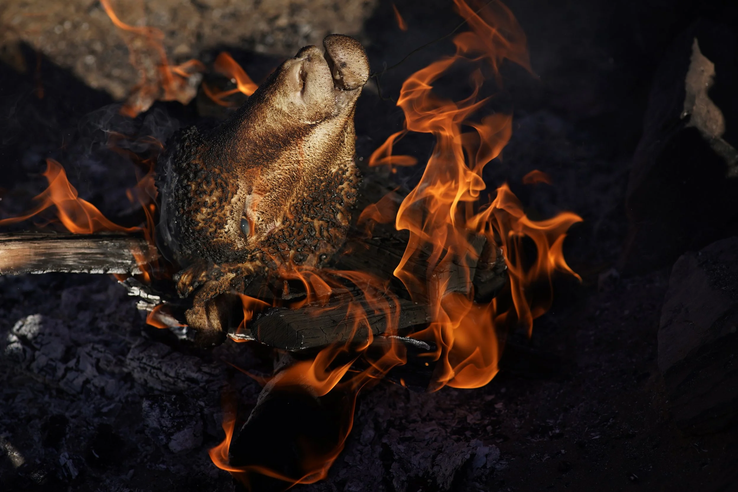 Jay Begay Sr. singes the head of a sheep after butchering the animal Wednesday, Sept. 6, 2023, in the community of Rocky Ridge, Ariz., on the Navajo Nation. The head is singed to prepare it for eating later. (AP Photo/John Locher)