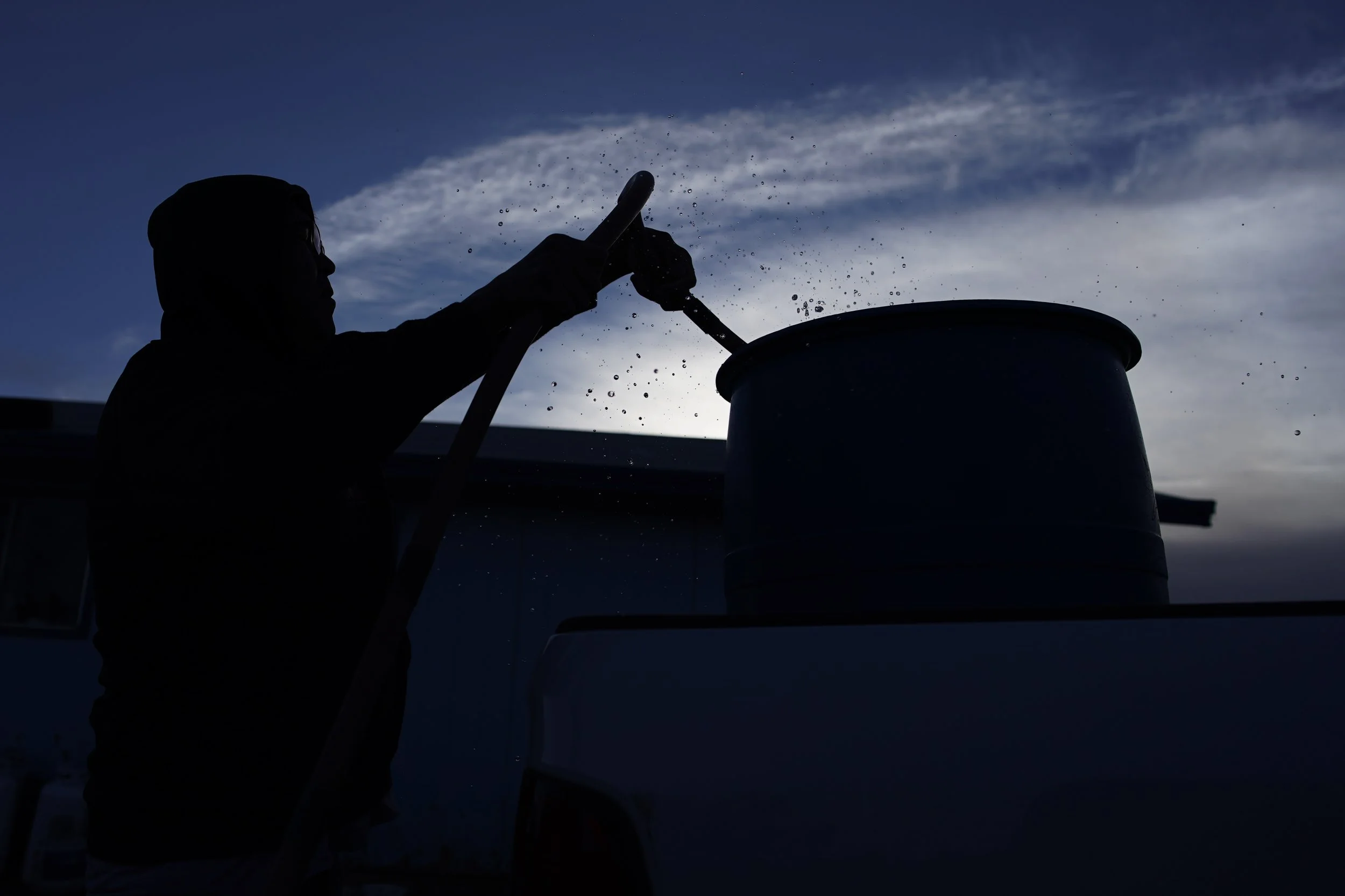 Jay Begay fills up a barrel with water for his sheep and other animals at his home Sunday, Oct. 30, 2022, in the community of Rocky Ridge, Ariz., on the Navajo Nation. (AP Photo/John Locher)