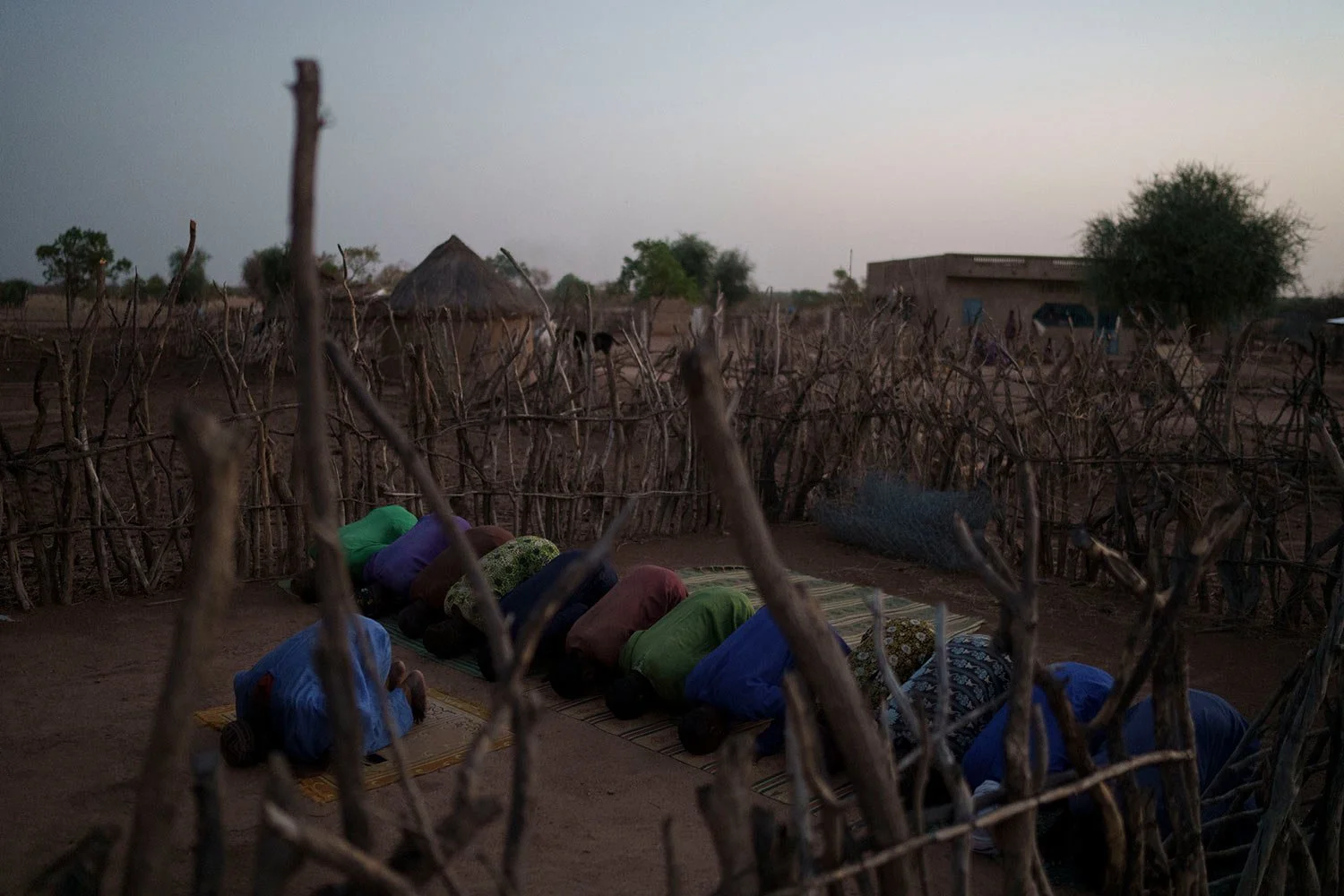 Members of the community pray during the holy month of Ramadan in front of their mosque in the village of Anndiare, in the Matam region of Senegal, Wednesday, April 12, 2023. (AP Photo/Leo Correa)