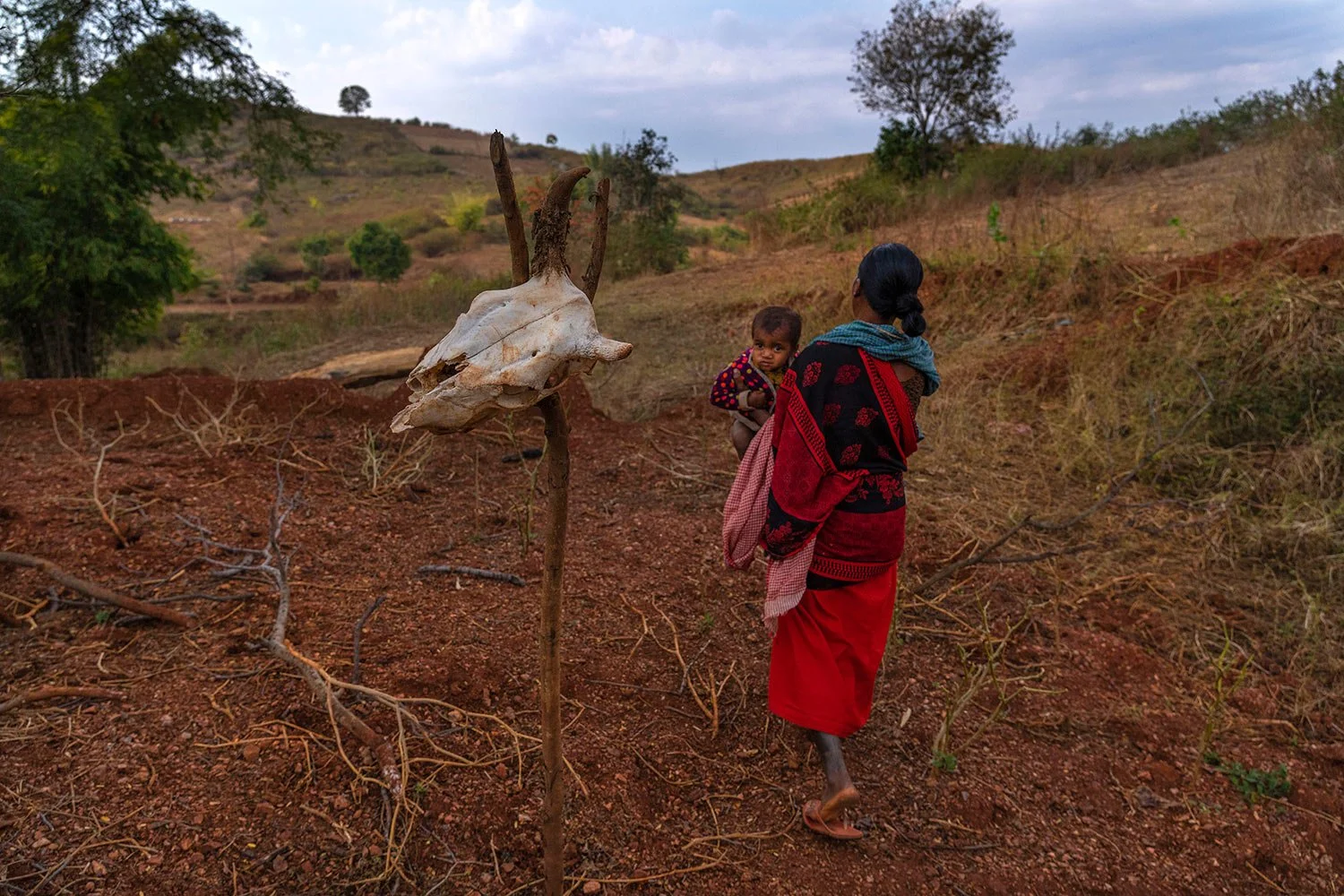 An Indigenous woman holds her son as she walks past a cow's skull hanging off a stick in a field in Chandragad village, in Ambikapur district, Chhattisgarh state, Wednesday, March 22, 2023. (AP Photo/Rafiq Maqbool)