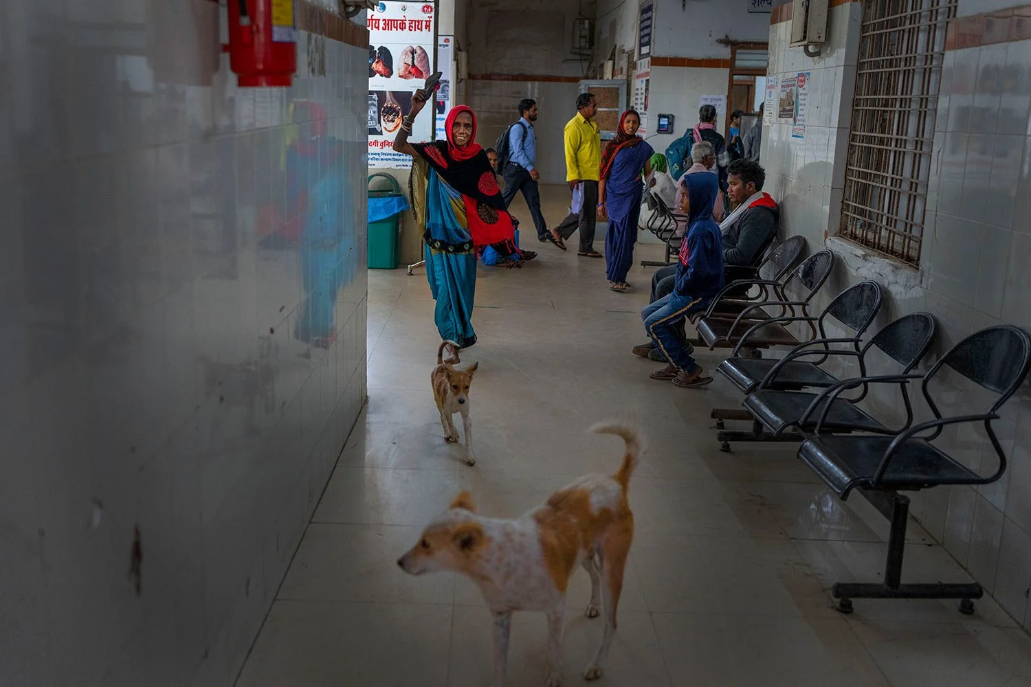 A woman chases away stray dogs as patients wait for their turn to see doctors at a government run hospital in Ambikapur district, Chhattisgarh state, India, Tuesday, March 21, 2023. (AP Photo/Rafiq Maqbool)