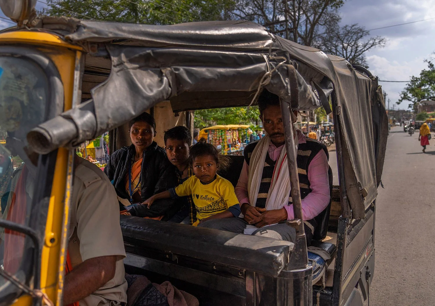 Raja Babu, 3, second from right, who has sickle cell disease travels with his family in a three wheeler after visiting a hospital for treatment in Ambikapur district, Chhattisgarh state, India, Monday, March 20, 2023. (AP Photo/Rafiq Maqbool)