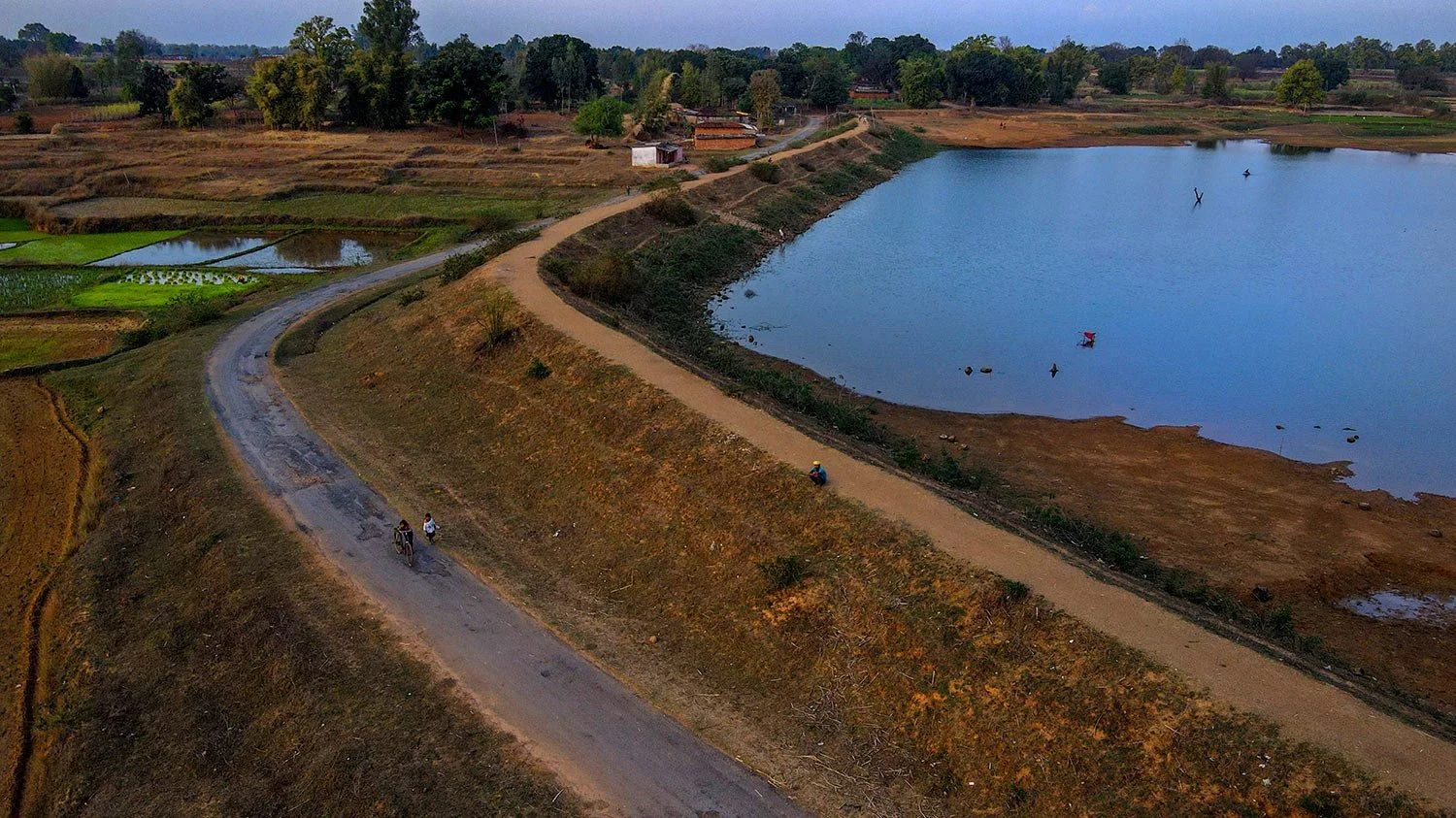 A villager sits on the shore of a lake in Haripur village in Ambikapur district, Chhattisgarh state, India, Monday, March 20, 2023. (AP Photo/Rafiq Maqbool)