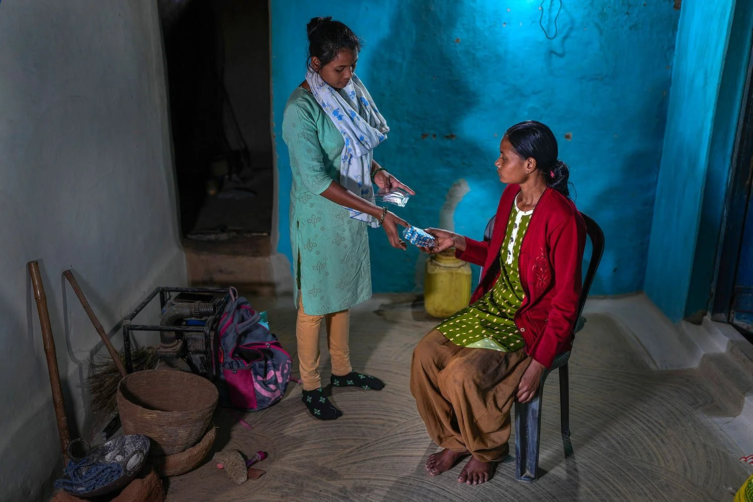 Social worker Geeta Aayam, left, gives free medicine to Poonam Gond during her visit to Gond’s house in Haripur village in Ambikapur district, Chhattisgarh state, India, Monday, March 20, 2023. (AP Photo/Rafiq Maqbool)
