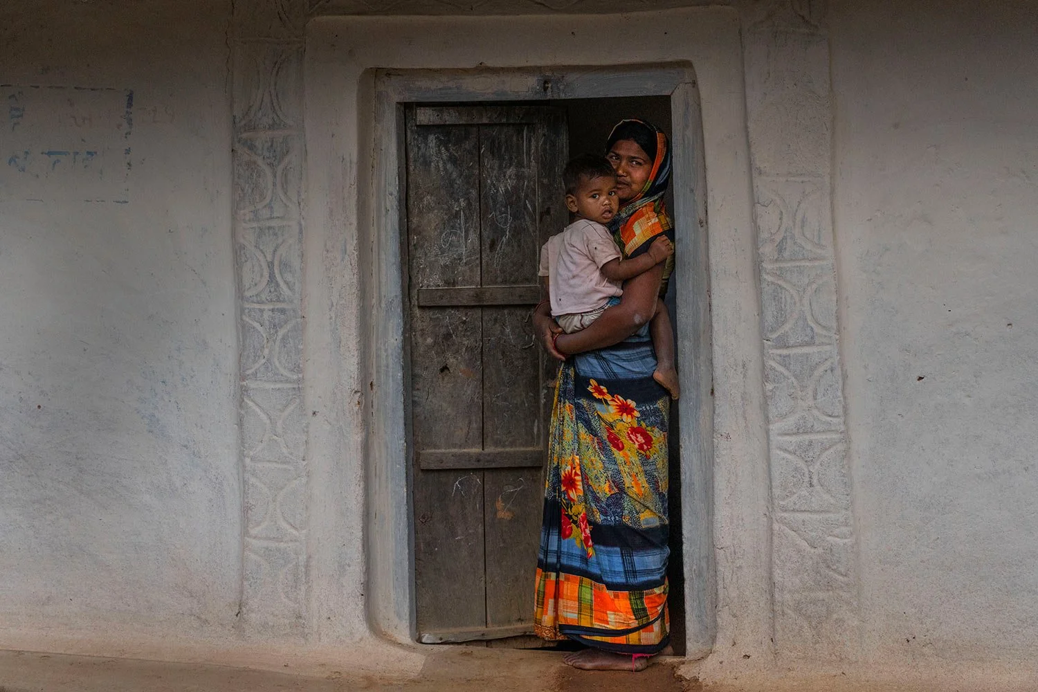 A woman and her child stand in a door as health workers test for sickle cell disease in Haripur village in Ambikapur district, Chhattisgarh state, India, Monday, March 20, 2023. (AP Photo/Rafiq Maqbool)