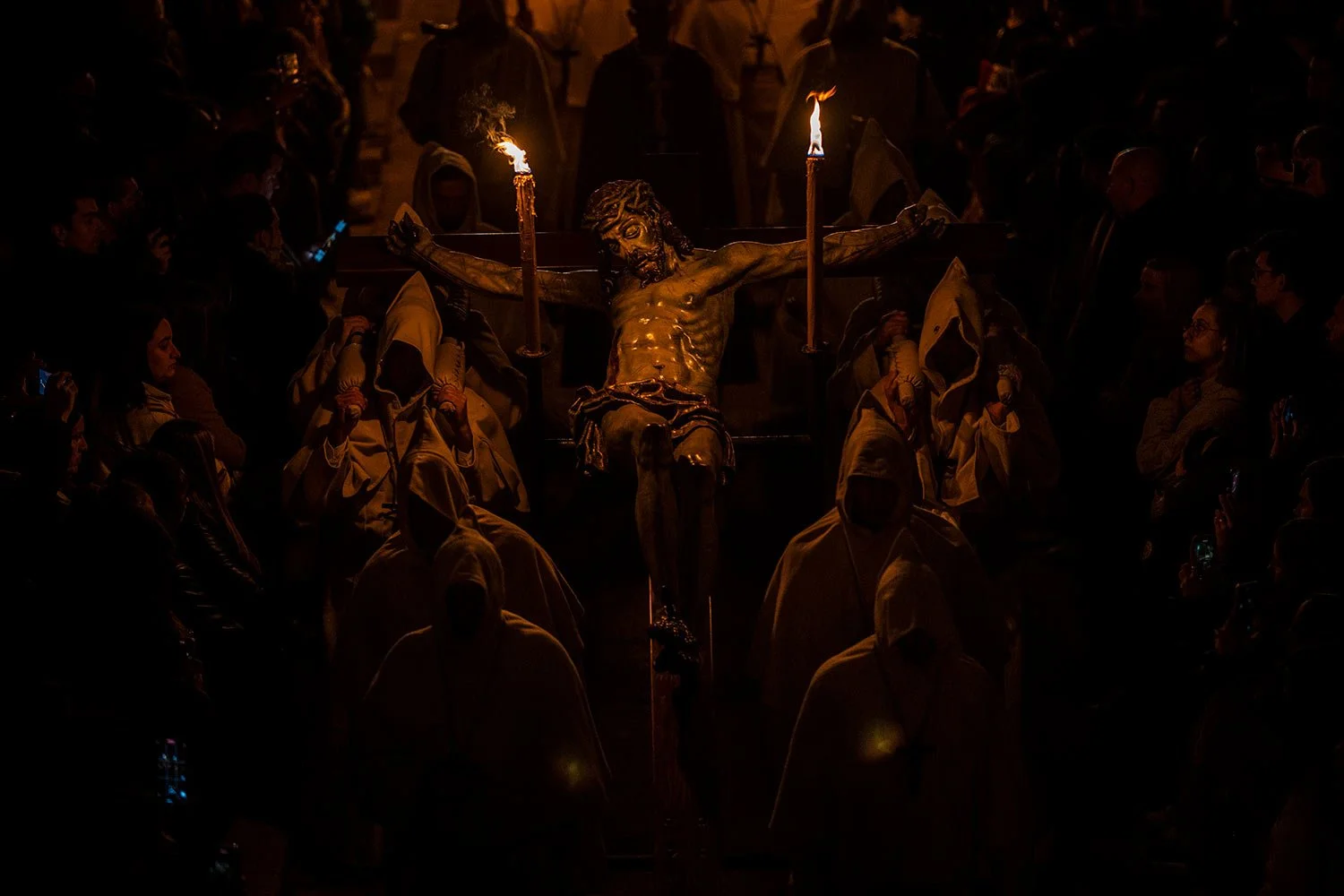 Penitents from the 'Cristo de la Buena Muerte' brotherhood carry a wooden image representing Jesus Christ as they take part in a procession in Zamora, Spain, early Tuesday, April 4, 2023. (AP Photo/Bernat Armangue)