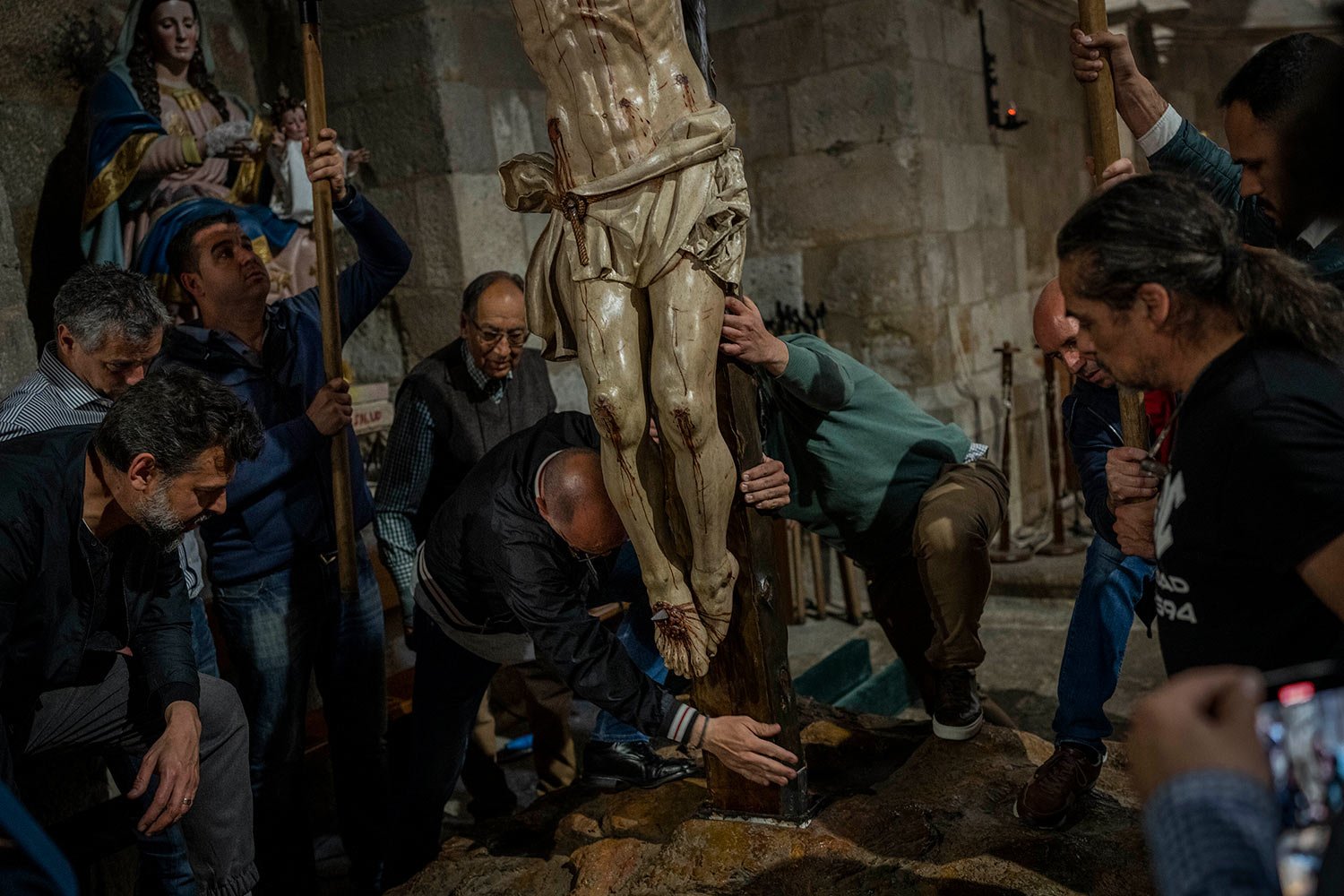 Members of the "Las Siete Palabras" brotherhood place the "Cristo de la agonía" as part of the preparation for a Holy Week procession in Zamora, Spain, Monday, April 3, 2023. (AP Photo/Bernat Armangue)