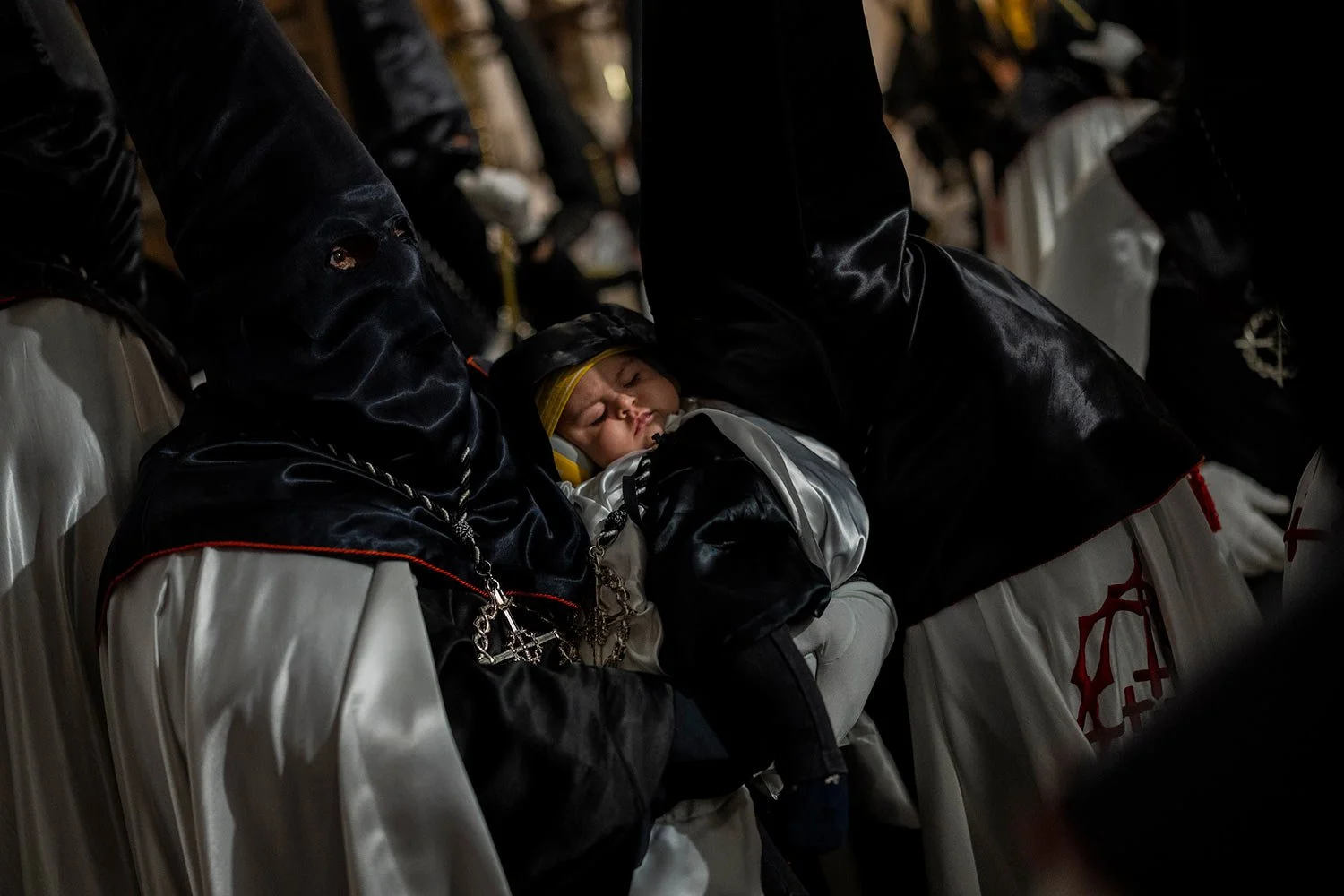 A baby dressed as a penitent sleeps before the start of the "Hermandad de Jesús en su tercera caída" procession during Spain's Holy Week in Zamora, Spain, Monday, April 3, 2023. (AP Photo/Bernat Armangue)