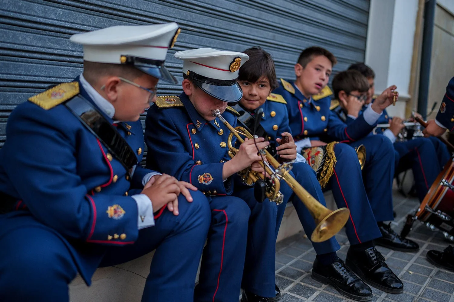 Members of the band practice prior to the procession at the Veracruz church in Aguilar de la Frontera, southern Spain, Tuesday, April 4, 2023. (AP Photo/Manu Fernandez)