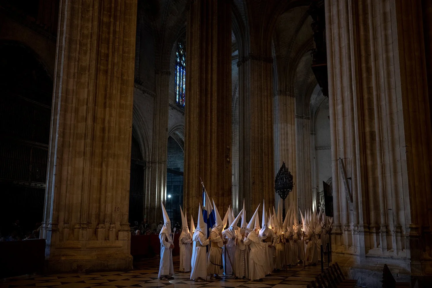 Penitents from "La Candelaria" brotherhood walk across the Seville cathedral as they takes part in a procession, Spain, Tuesday, April 4, 2023. (AP Photo/Emilio Morenatti)