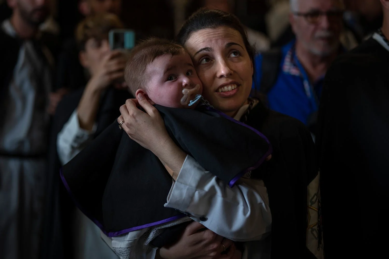 A penitent of "Santa Genoveva" brotherhood holds a baby as they watch at the Virgin Mary before taking part in a procession in Seville, Spain, Monday, April 3, 2023. (AP Photo/Emilio Morenatti)