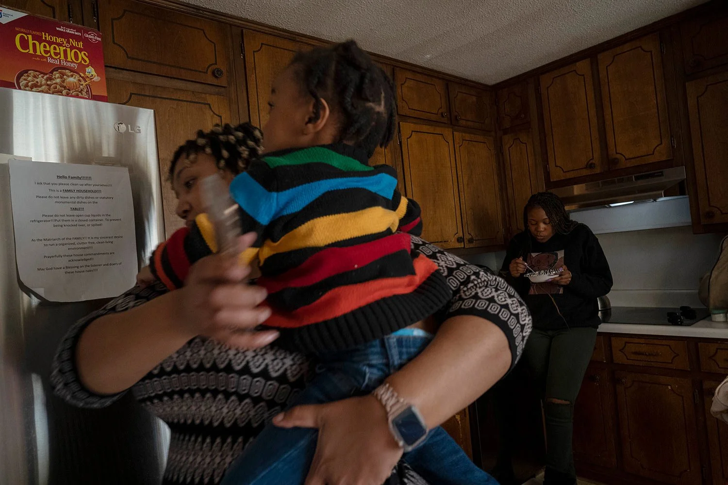 Angelica Lyons carries her son while her younger sister, Ansonia Lyons, finishes a snack in the background, in Birmingham, Ala., on Saturday, Feb. 5, 2022. (AP Photo/Wong Maye-E)