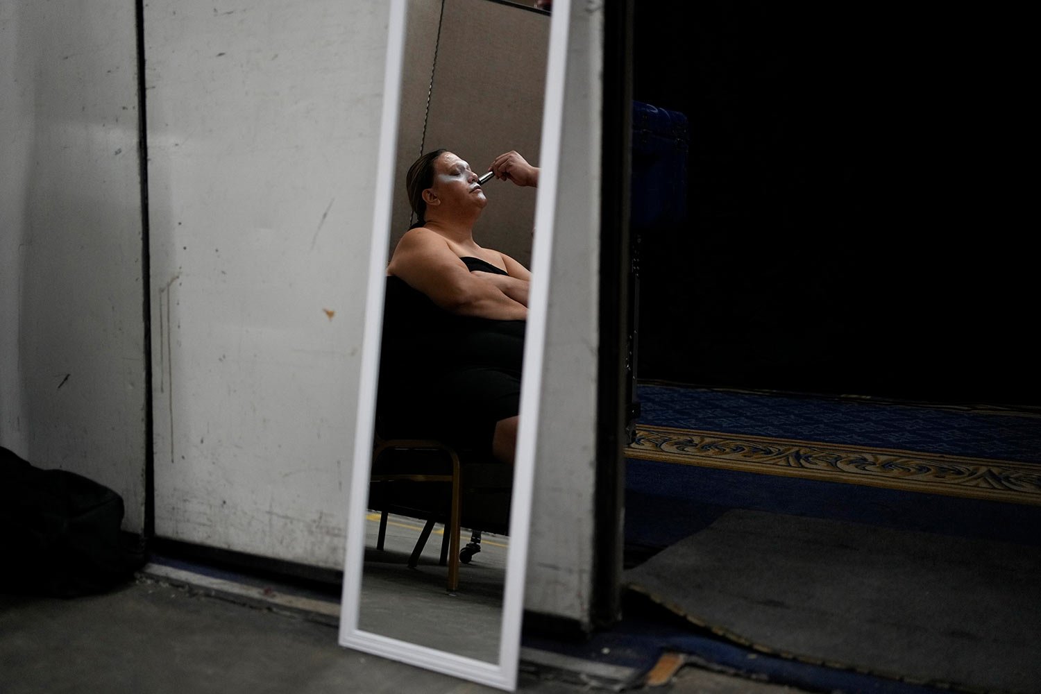 Selena D'Angelo prepares backstage before performing in the Mahu Magic drag show at the Western Regional Native Hawaiian Convention, Tuesday, June 20, 2023, in Las Vegas. (AP Photo/John Locher)