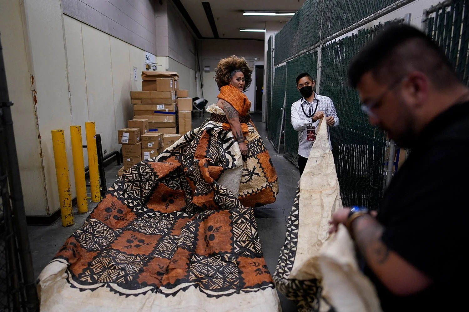 Hinaleimoana Wong-Kalu, left, gets dressed before the Mahu Magic drag show at the Western Regional Native Hawaiian Convention, Tuesday, June 20, 2023, in Las Vegas. (AP Photo/John Locher)