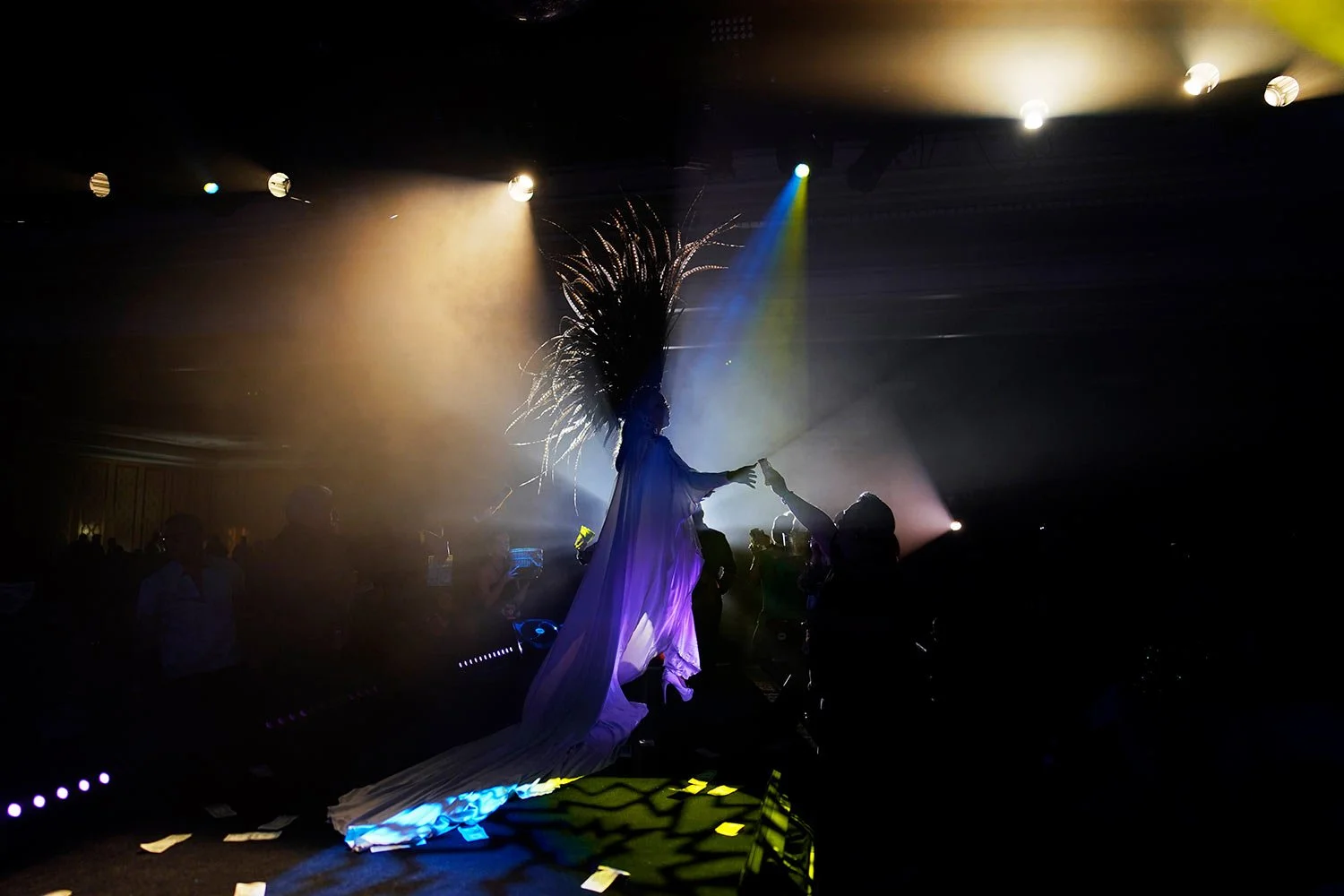 Kiana Jacobs waves to the crowd after performing in the Mahu Magic drag show at the Western Regional Native Hawaiian Convention, Tuesday, June 20, 2023, in Las Vegas. (AP Photo/John Locher)