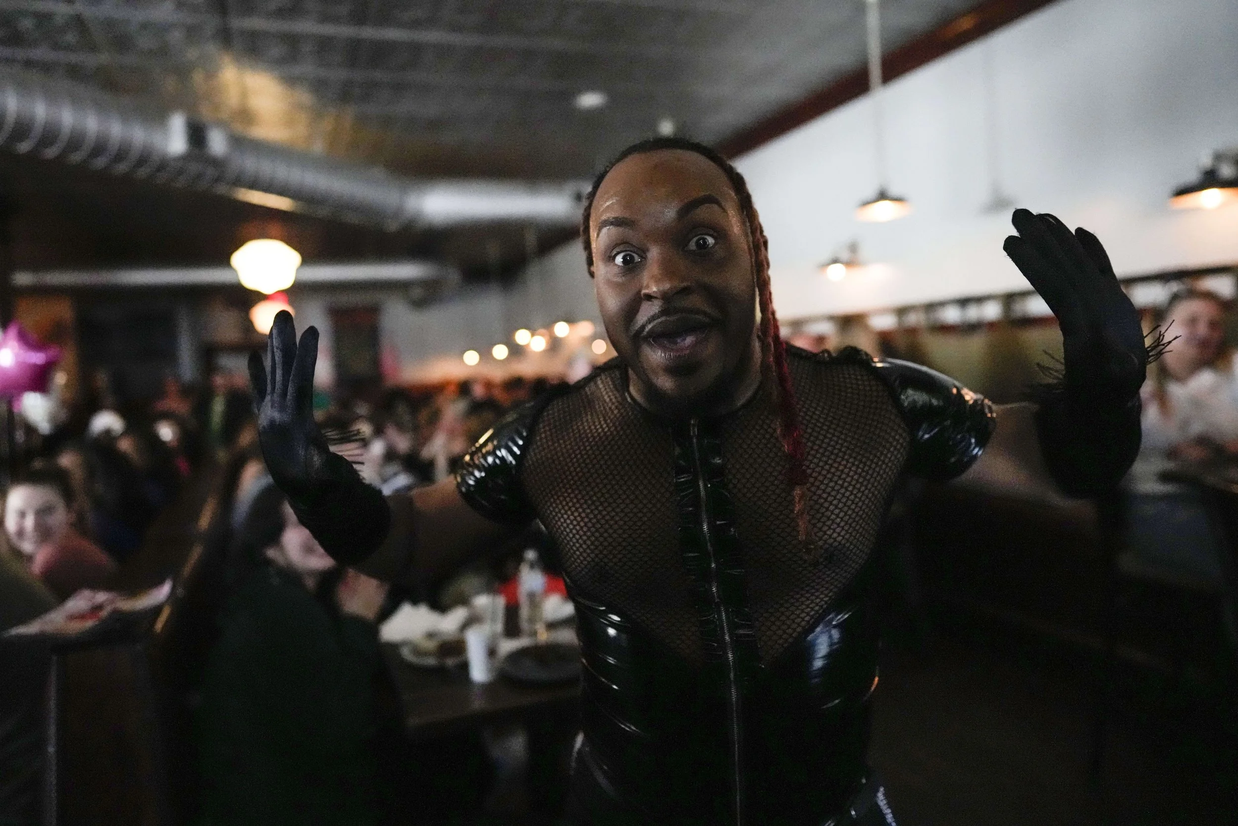 Carlos Ova-Dupree performs during the "Mimosas & Heels Drag Brunch" at the Public House, Sunday, March 5, 2023, in Norfolk, Va. The drag bunch was hosted by Harpy Daniels and Javon Love. (AP Photo/Carolyn Kaster)