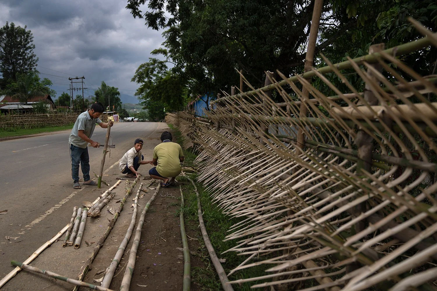 Tribal Kuki community members set up fortifications made of bamboo around their houses, chiseling its edges in the shape of spears in Kuki-controlled Churachandpur district, in the northeastern Indian state of Manipur, Tuesday, June 20, 2023. (AP Photo/Altaf Qadri)