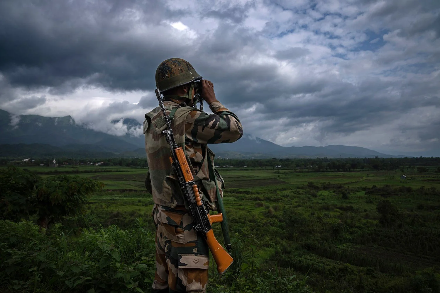Two months since the conflict began, hundreds of roadblocks and sandbag bunkers dot highways across the torn Manipur lands. Most of these imaginary borders are controlled by the warring communities. Those left unattended have been taken over by Indian forces who peep from binoculars into each side where armed bands in camouflage rev motorcycles.