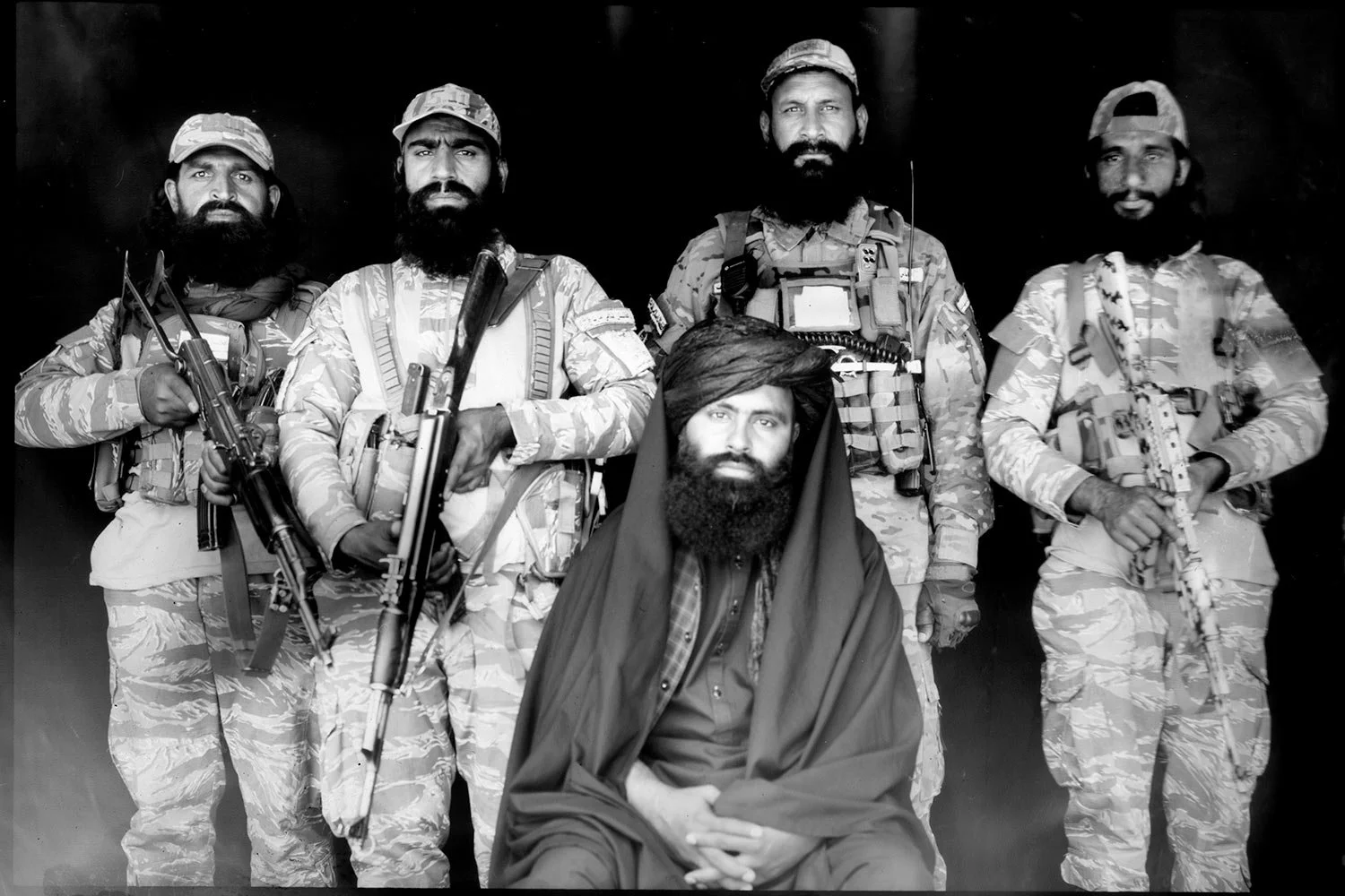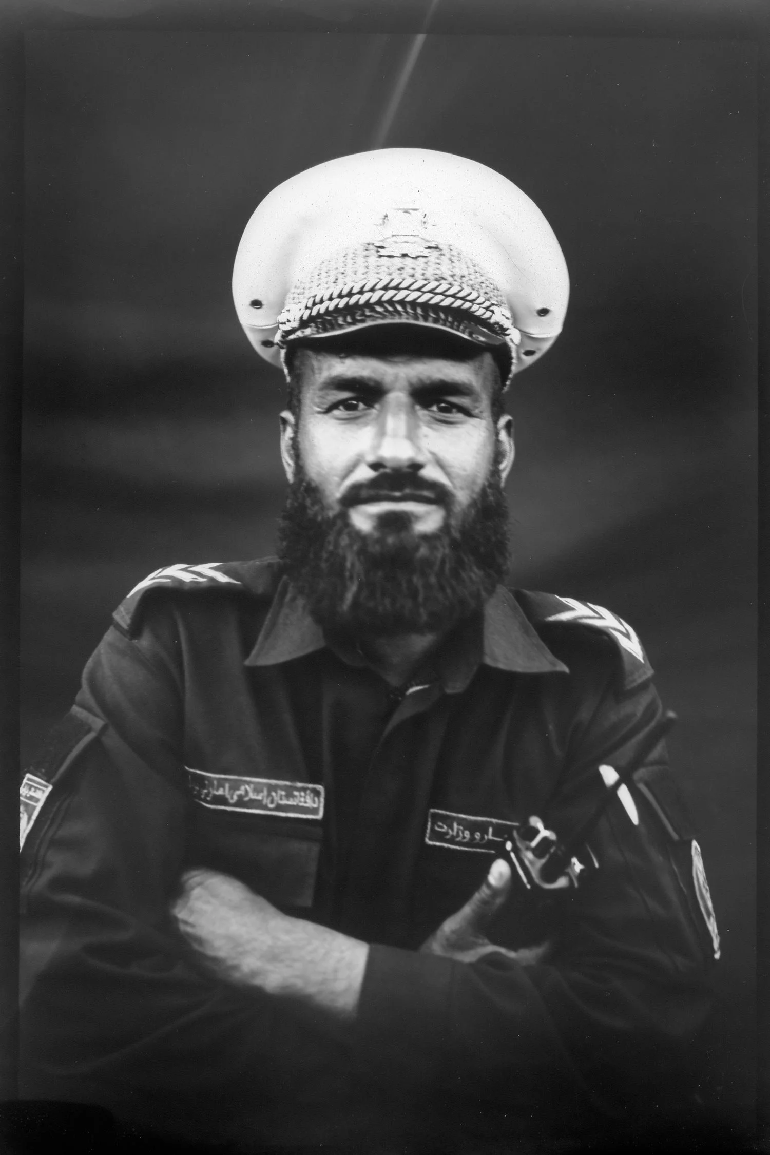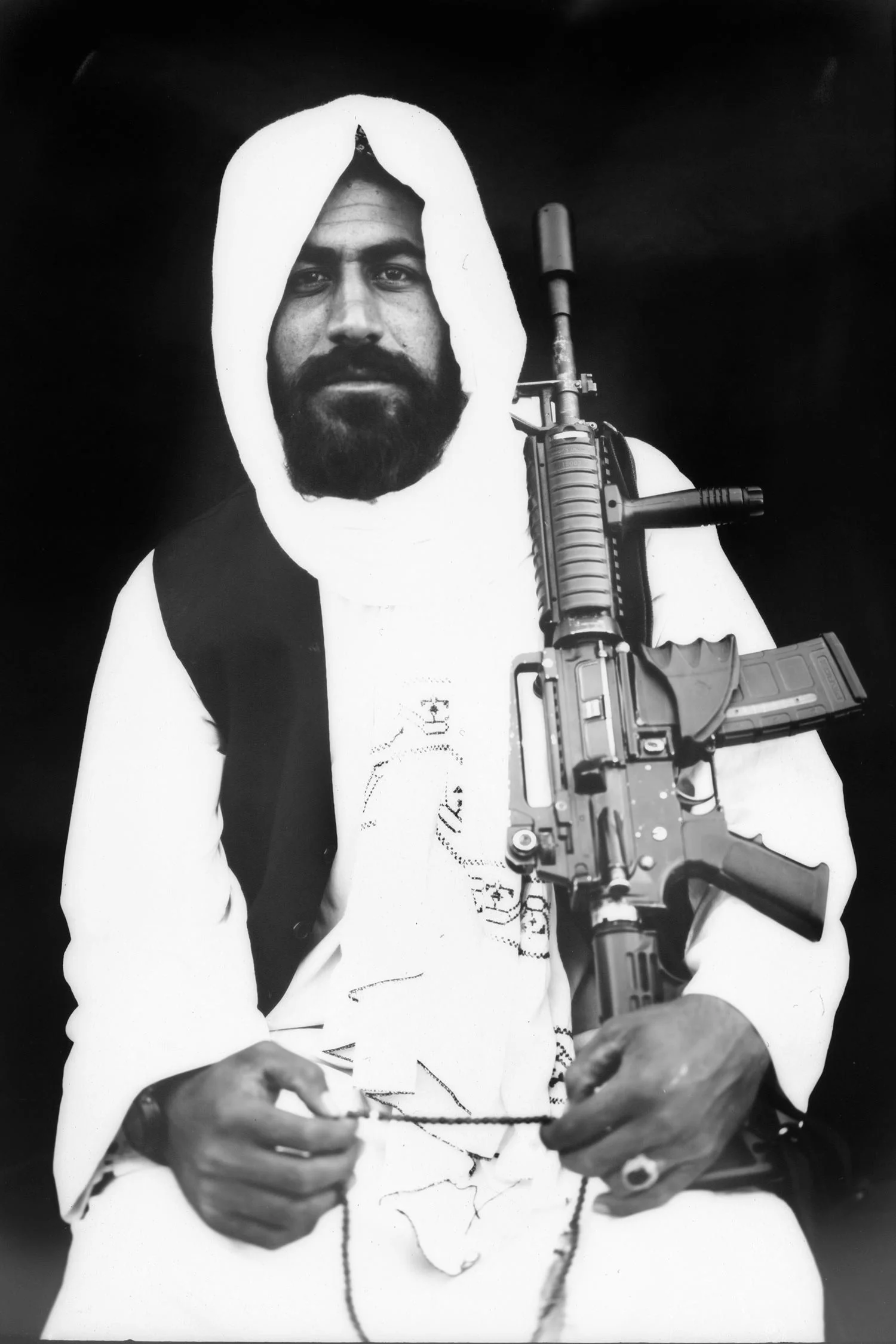 Outside a warehouse in Kabul, a group of men watch intently as the camera is set up. At first, they seem shy. But as the first portraits emerge, curiosity overtakes their reservations. Soon, they’re smiling and joking as they wait to have their photos taken, pitching in to help when a black cloth backdrop slips off the wall. As each man steps forward for his portrait, set jaws replace tentative smiles. Adjusting their grip on their assault rifles, they look straight into the camera’s tiny lens and hold their poses.