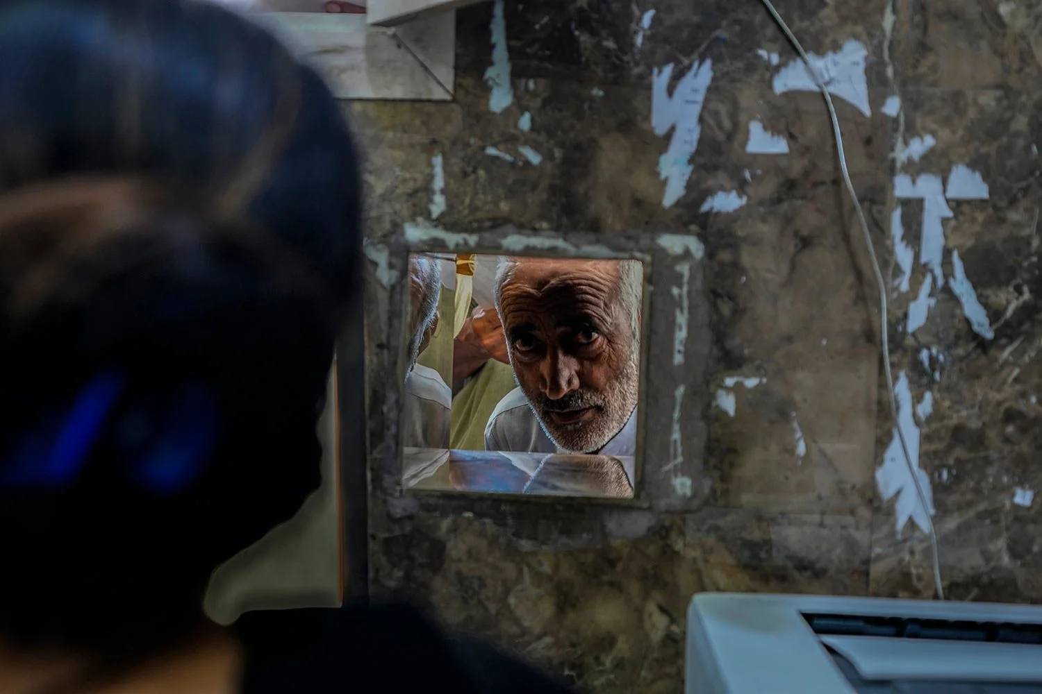 A Kashmiri man looks through a narrow opening at the registration counter of a mental health hospital in Srinagar, Indian controlled Kashmir, Tuesday, Aug 1, 2023. (AP Photo/Mukhtar Khan)