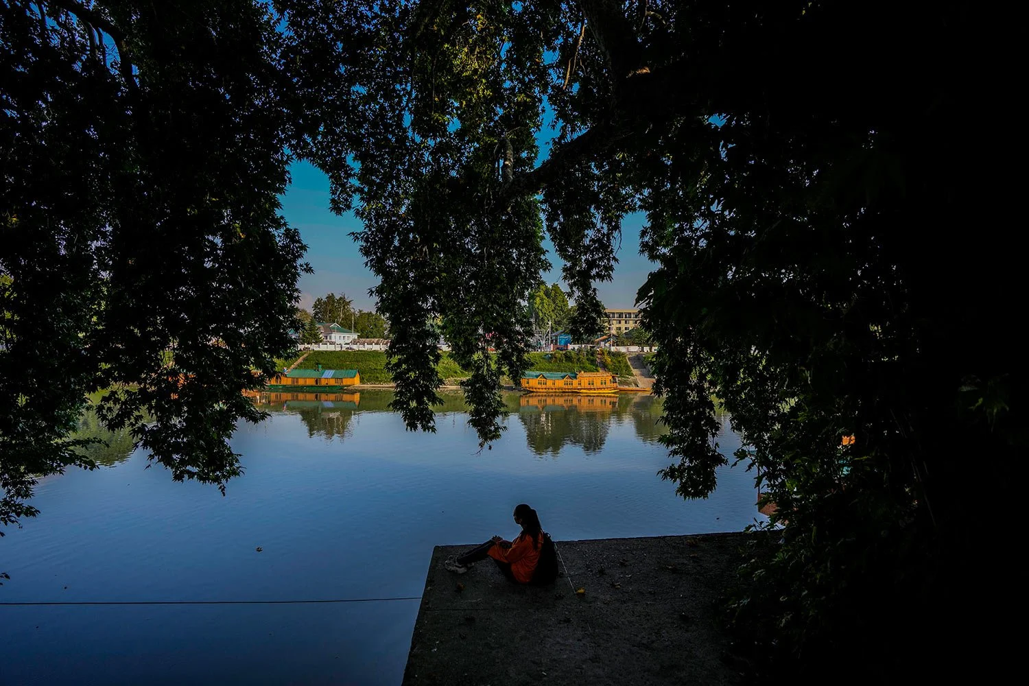 Kashmiri student Aayat hameed sits on the banks of the Jehlum river in Srinagar, Indian controlled Kashmir, Friday, Aug 18, 2023. (AP Photo/Mukhtar Khan)