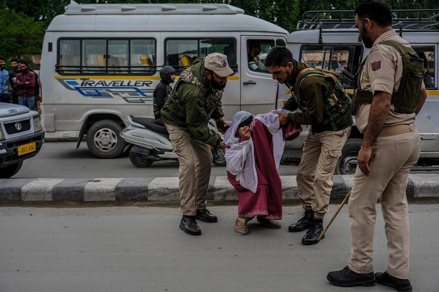 Policemen rescue an elderly Kashmiri woman who tried to kill herself on the banks of the Dal lake in Srinagar, Indian controlled Kashmir, Thursday, May 18, 2023. (AP Photo/Mukhtar Khan)