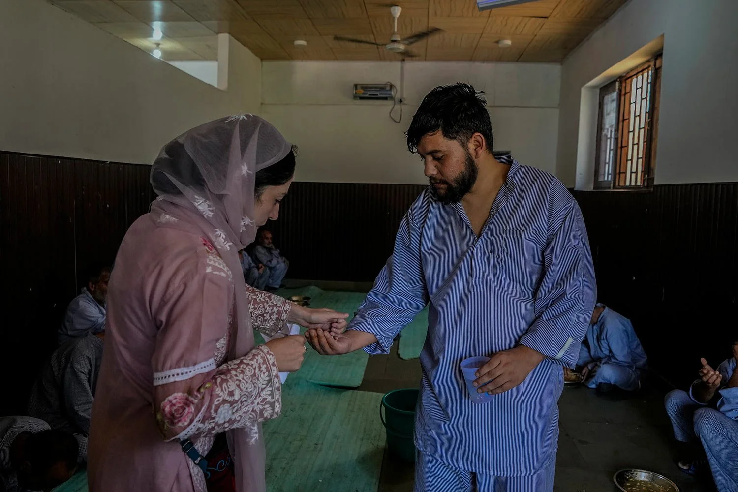 A staff member of a mental health hospital serves drinking water to a patient inside a mental health hospital in Srinagar, Indian controlled Kashmir, Tuesday, Aug 1, 2023. (AP Photo/Mukhtar Khan)