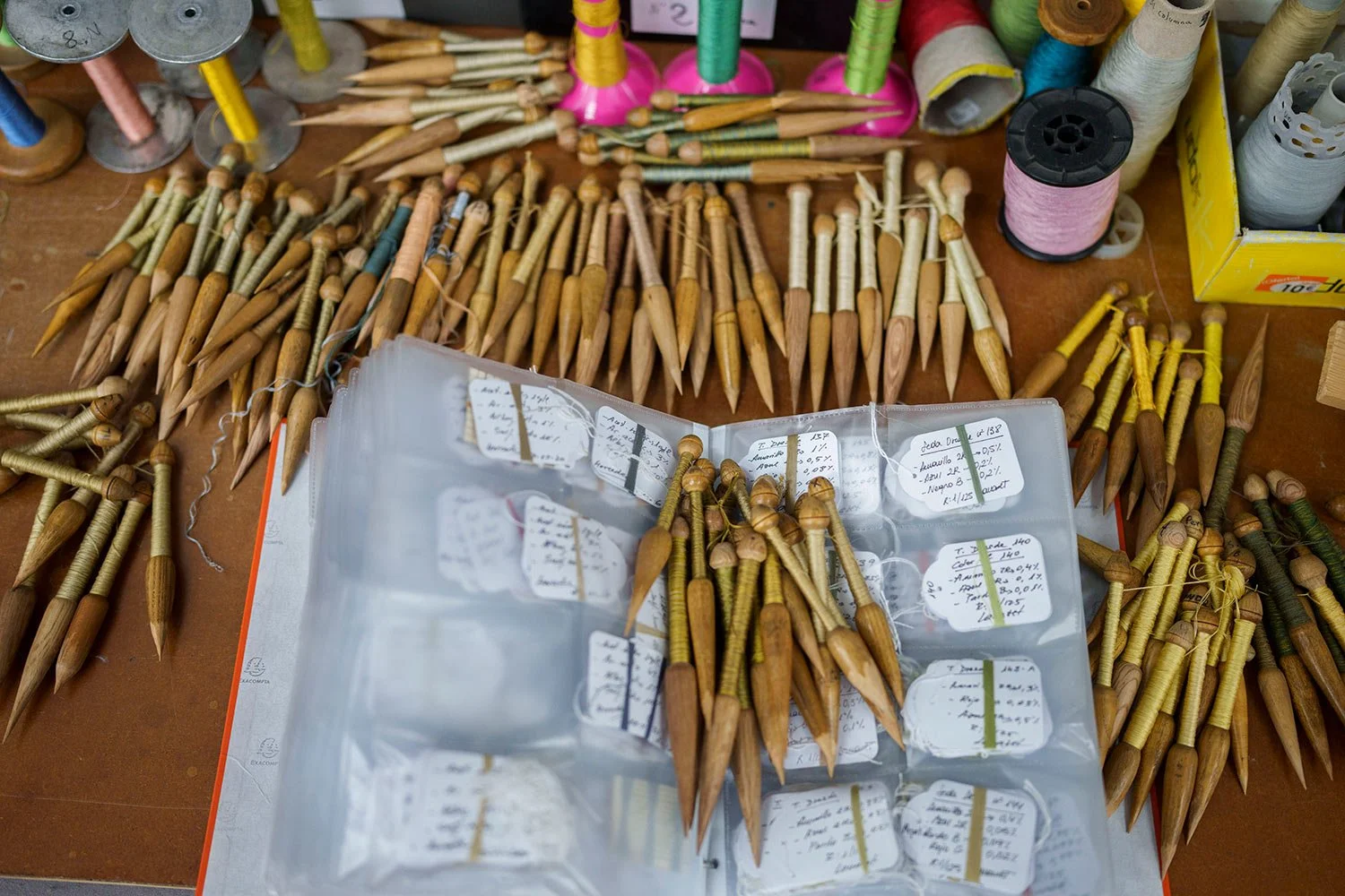 Threads and wool of all colors, bobbins, tools and spinning wheels are everywhere. Some of the original wooden machines are still in use.
