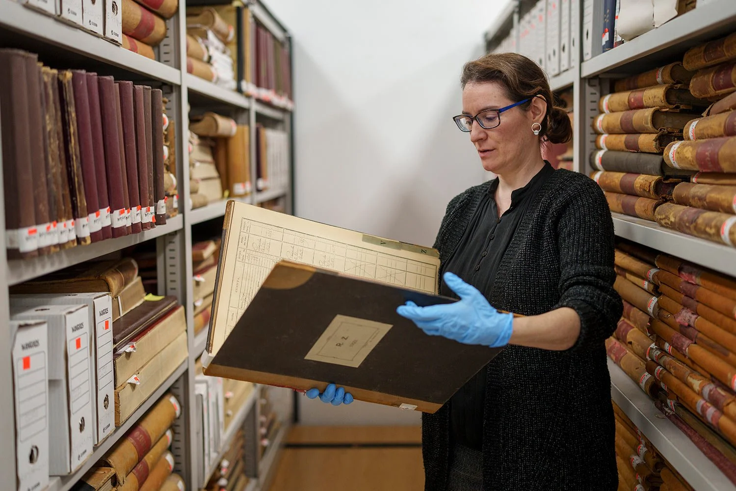 Archive and library manager Cristina de Mora shows a part of the archive collection at the Royal Tapestry Factory in Madrid, Spain, Friday, Nov. 30, 2023. (AP Photo/Manu Fernandez)
