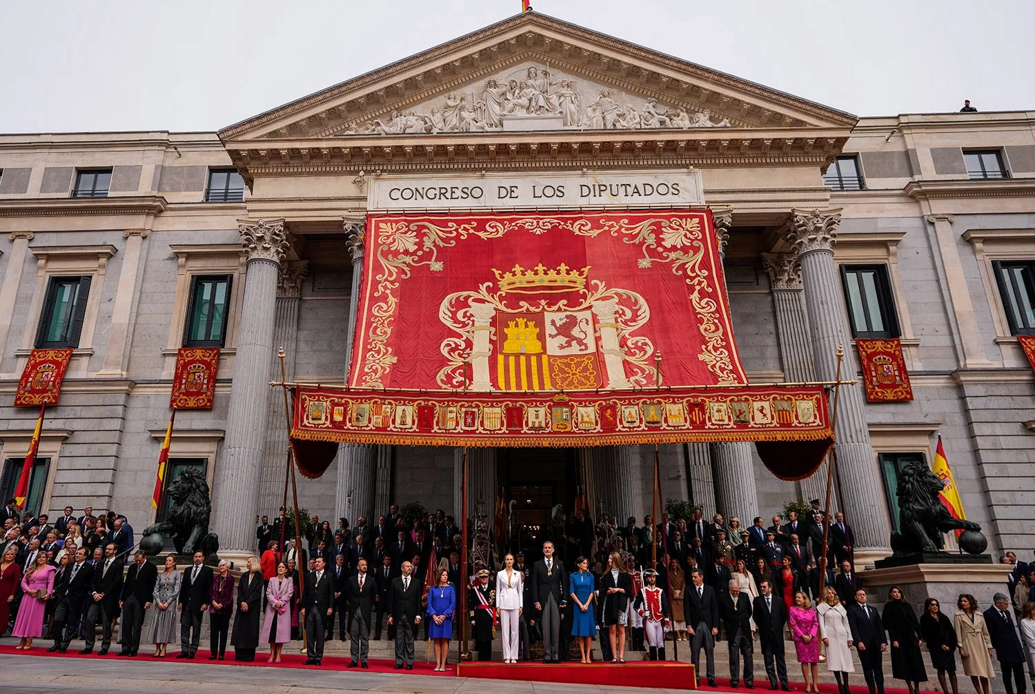 Princess Leonor, center, next to Spanish King Felipe VI, Queen Letizia and her sister Sofia, right, attend a military parade under the "baldachin," or canopy, after swearing allegiance to the Constitution during a gala event that makes her eligible to be queen one day, in Madrid on Tuesday, Oct. 31, 2023. (AP Photo/Manu Fernandez)