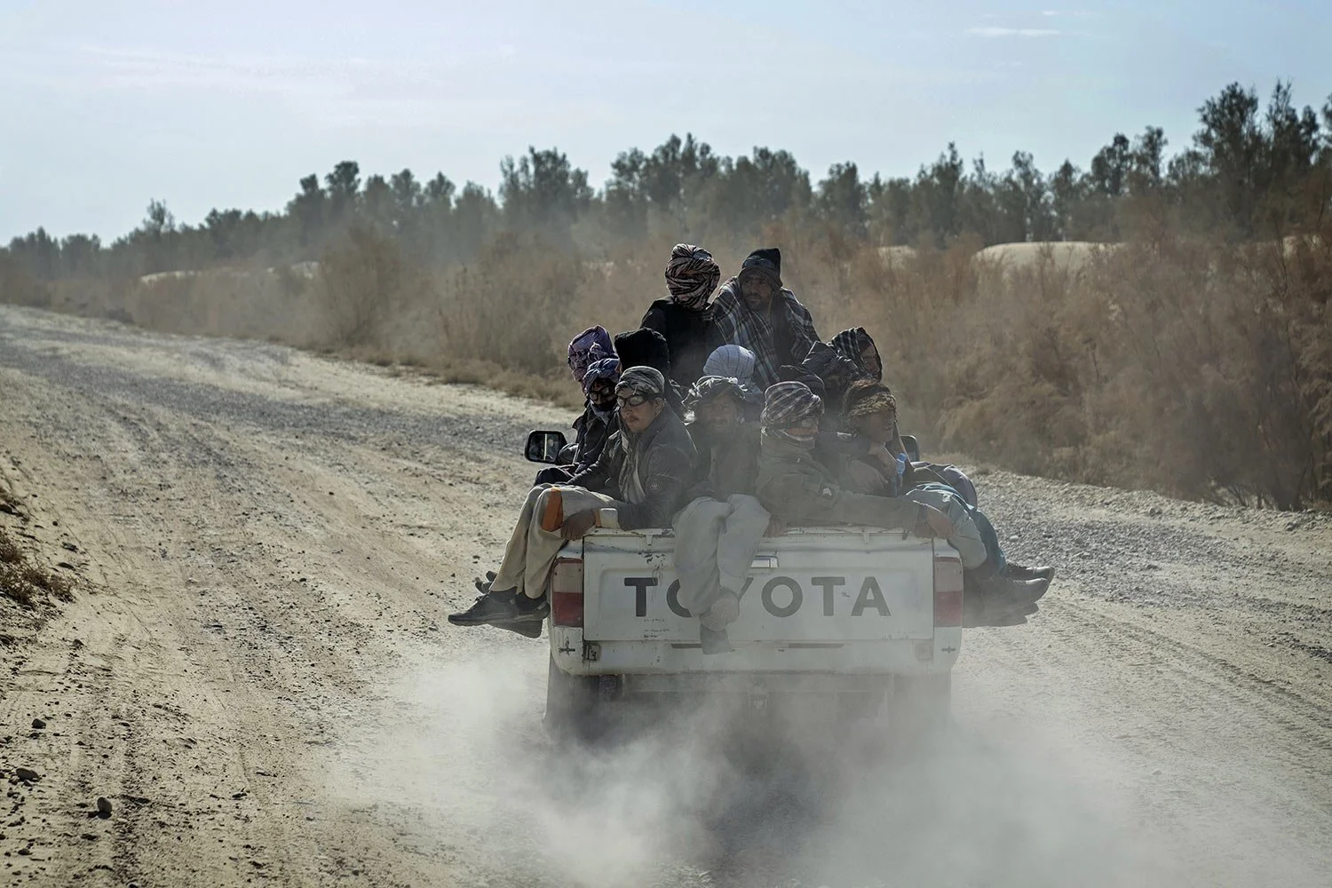 Afghan refugees sit in the back of a truck to go to Iran through the desert after crossing the borders of Afghanistan and Pakistan, on the outskirts of Zaranj city, Afghanistan, Dec. 24, 2023. (AP Photo/Ebrahim Noroozi)
