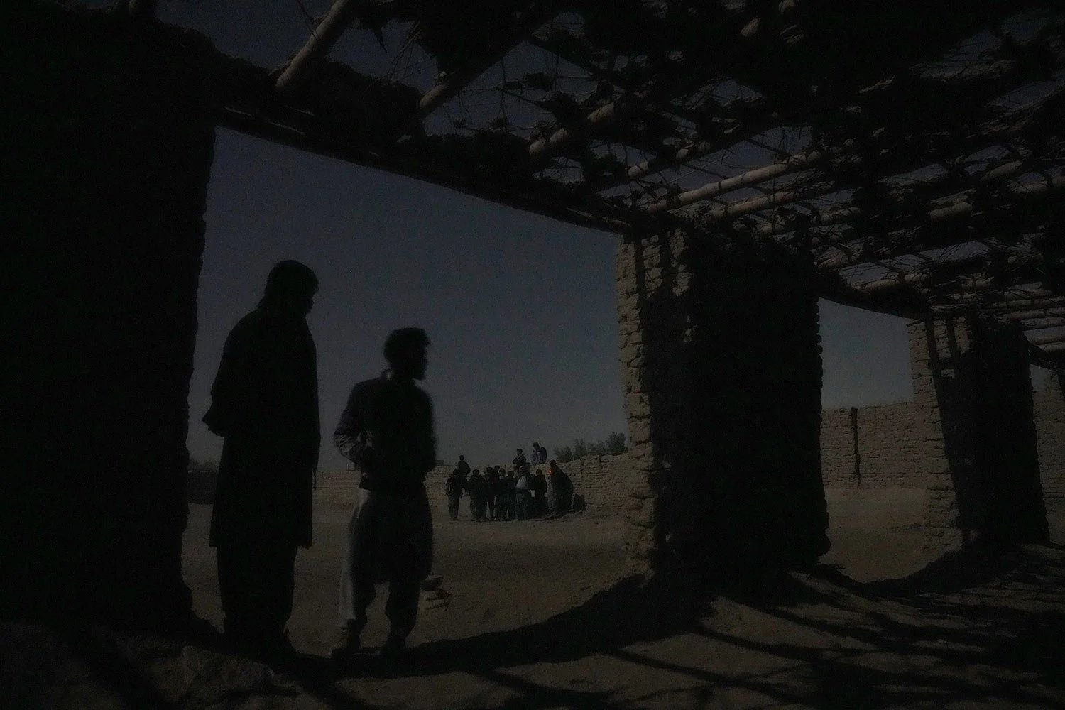 Young Shiite Afghan immigrants wait for midnight in ruins in the desert around the city of Zaranj, Afghanistan, near the the Iran-Afghanistan border wall, to try to cross over the Iranian border wall into Iran, Dec. 25, 2023. (AP Photo/Ebrahim Noroozi)