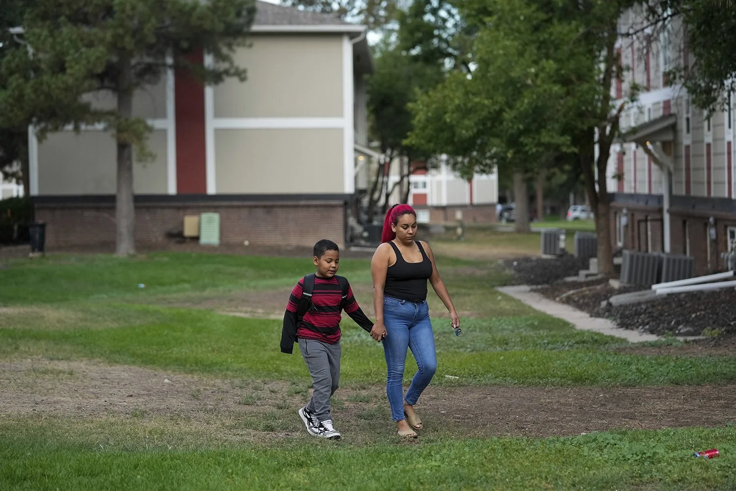 Gabriela Ramírez, right, walks her son Dylan to school Thursday, Aug. 29, 2024, in Aurora, Colo. (AP Photo/Godofredo A. Vásquez)