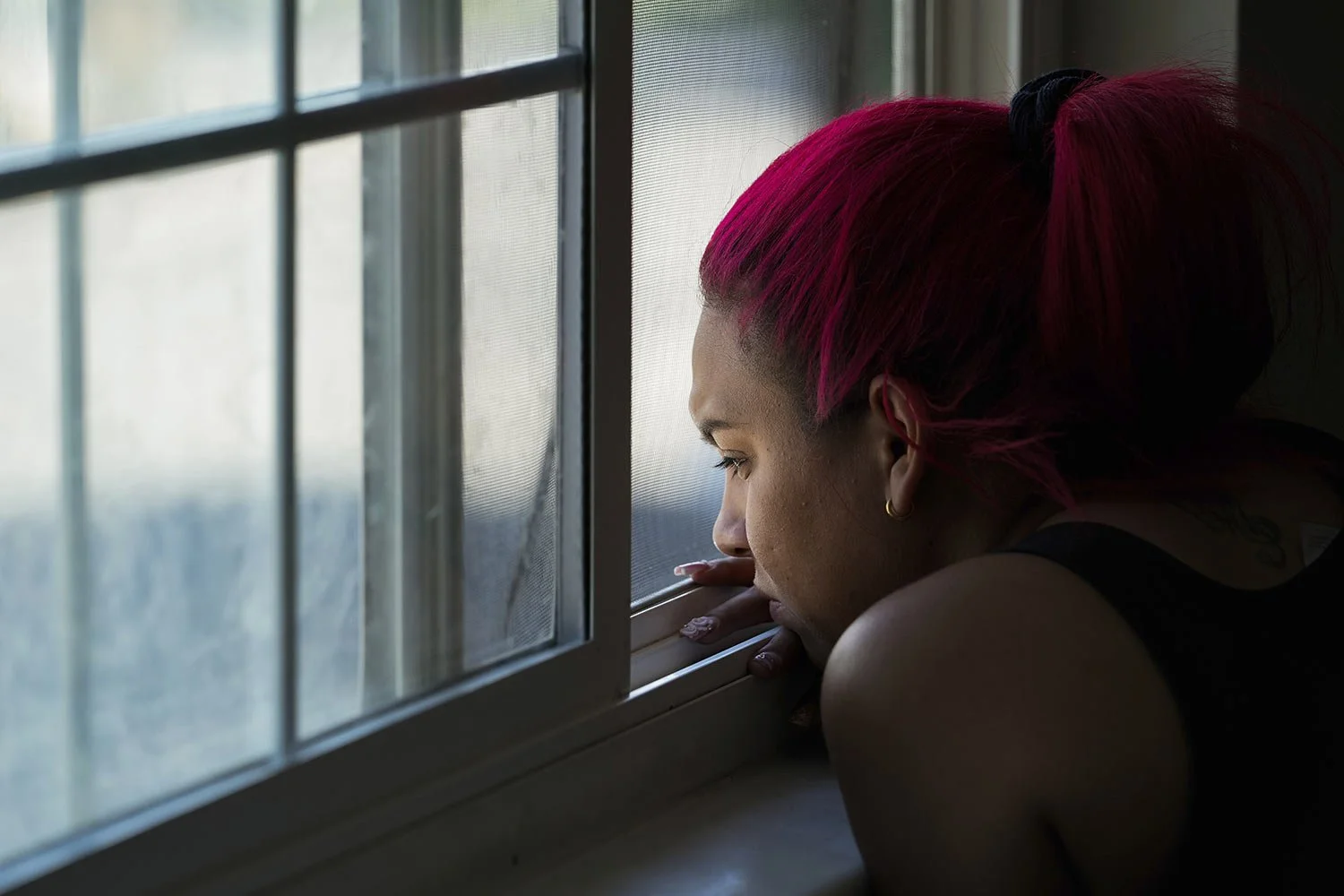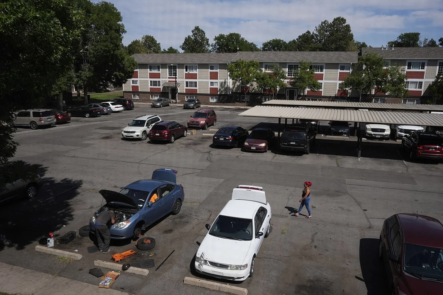 Gabriela Ramírez watches from a window as two of her friends try to repair her car Thursday, Aug. 29, 2024, in Aurora, Colo. (AP Photo/Godofredo A. Vásquez)