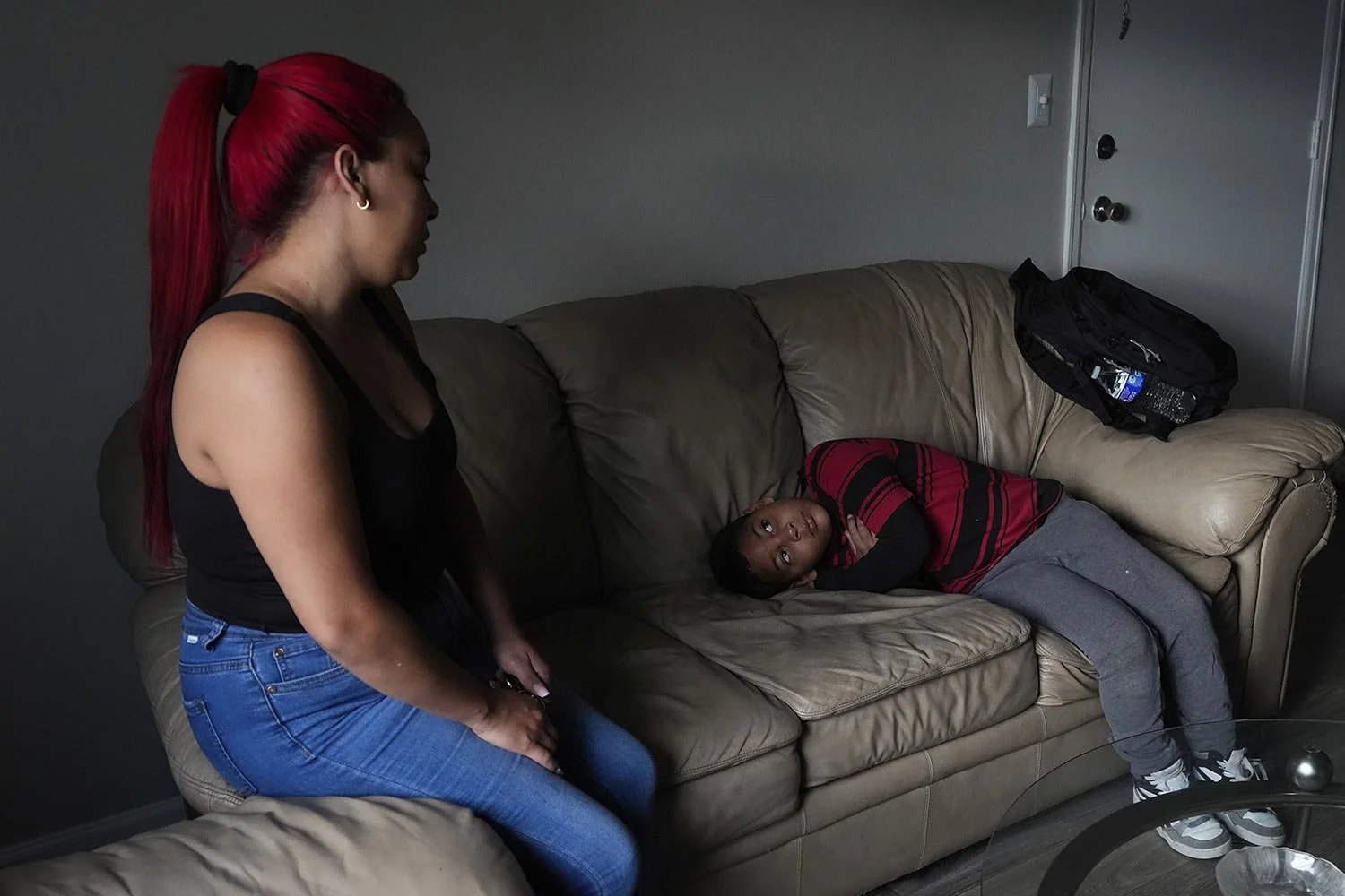 María Ángel Torres talks during an interview at her apartment as her daughter Alisson Ramírez and grandson Dylan Martínez play on their phones Friday, May 18, 2024, in Aurora, Colorado. (AP Photo/Jack Dempsey)