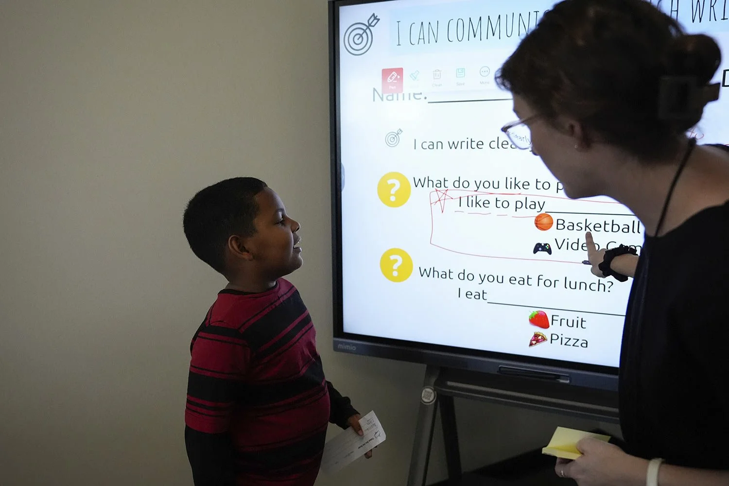 Dylan Martínez-Ramírez, left, sounds out a sentence as instructed by Culturally & Linguistically Diverse Education teacher Sarah Pearlstein at Del Mar Academy, Thursday, Aug. 29, 2024, in Aurora, Colo. (AP Photo/Godofredo A. Vásquez)