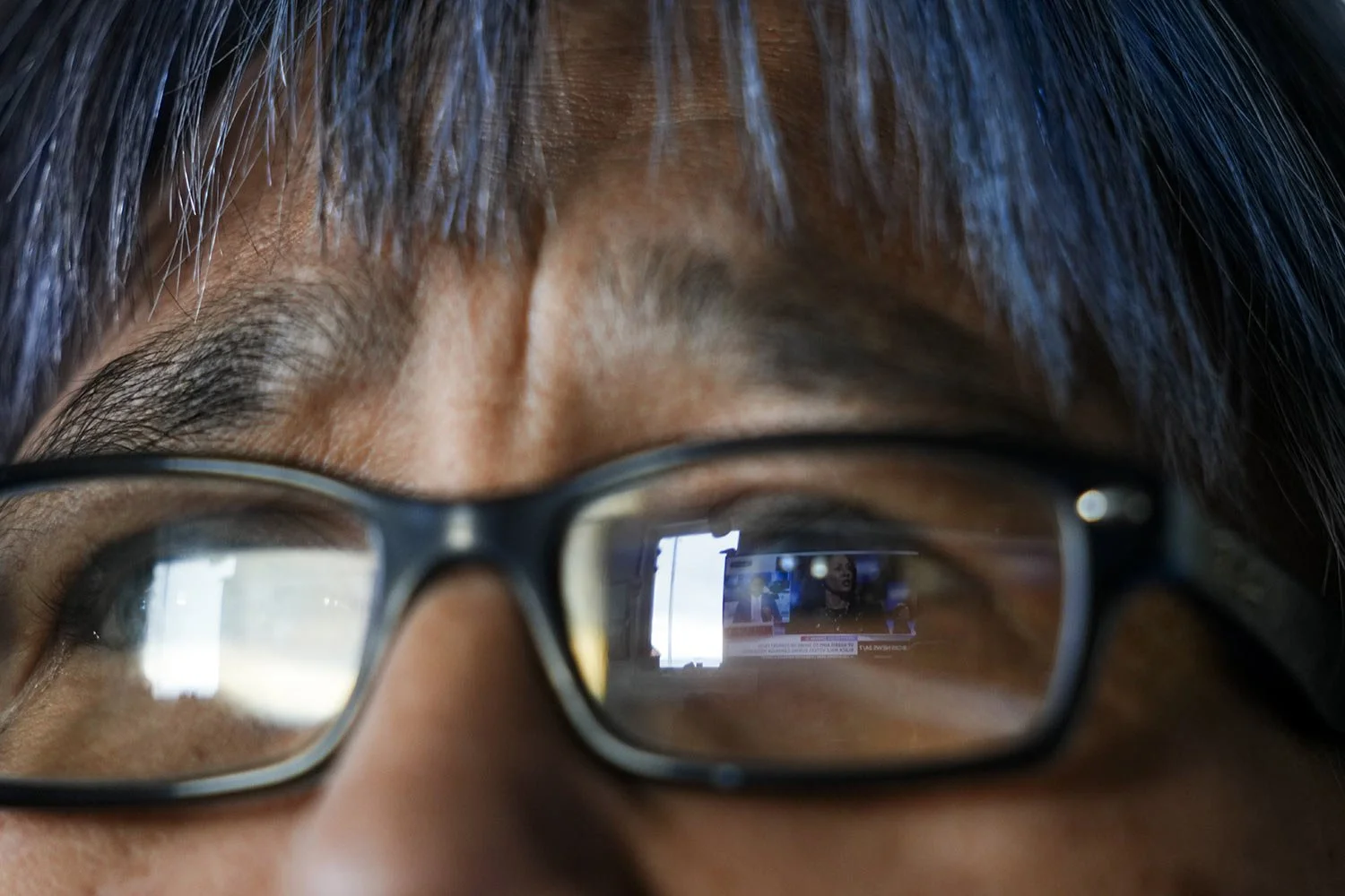 A CBS News broadcast showing Democratic presidential nominee Vice President Kamala Harris is reflected in the eyeglasses of Alice Aishanna as she watches television at her home in Kaktovik, Alaska, Tuesday, Oct. 15, 2024. (AP Photo/Lindsey Wasson)
