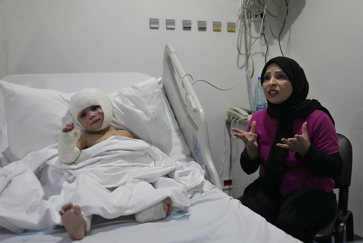 Fatima Zayoun, right, speaks as she sits next to her daughter Ivana Skakye, 2, who is suffering from third-degree burns over 40 percent of her body following an Israeli airstrike last September near their home in Deir Qanoun al Nahr a village in south Lebanon, at the Geitaoui hospital where she is receiving treatment, in Beirut, Lebanon, Tuesday, Oct. 29, 2024. (AP Photo/Hussein Malla)